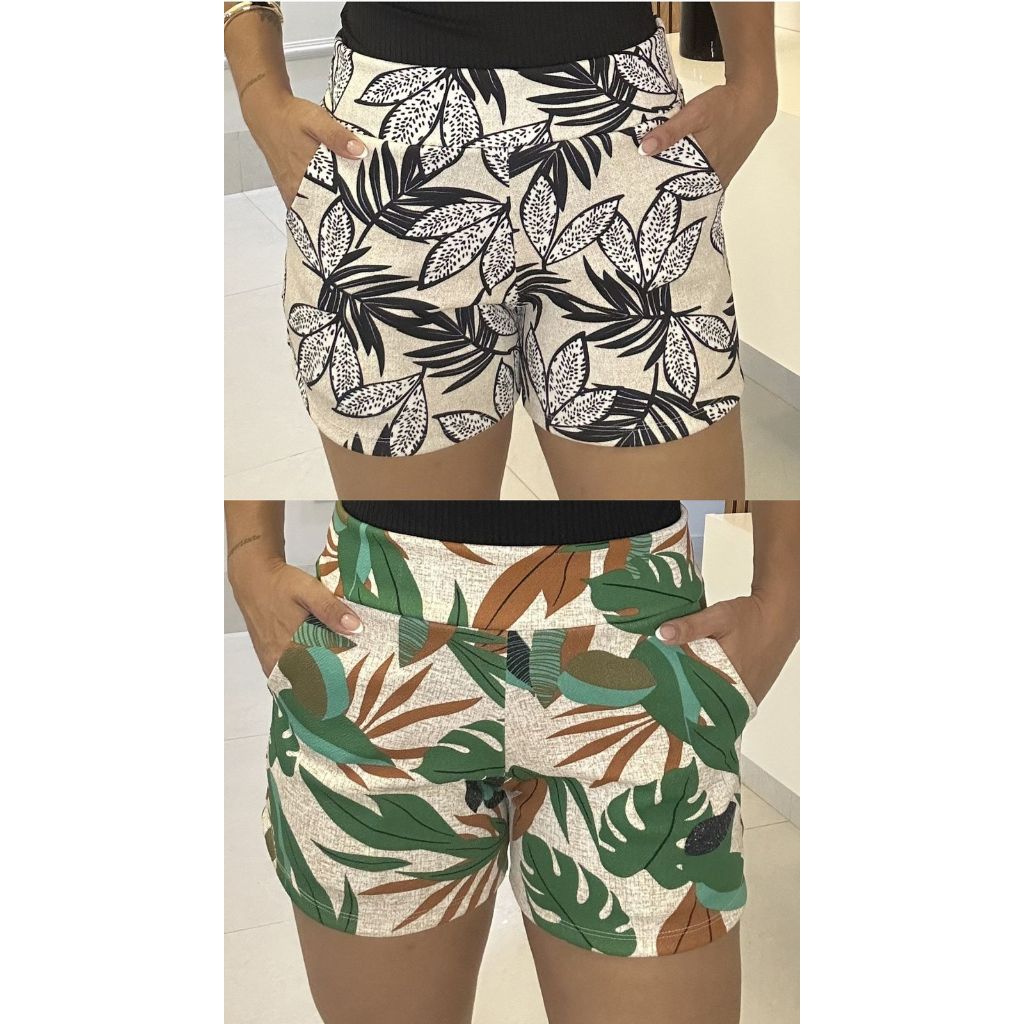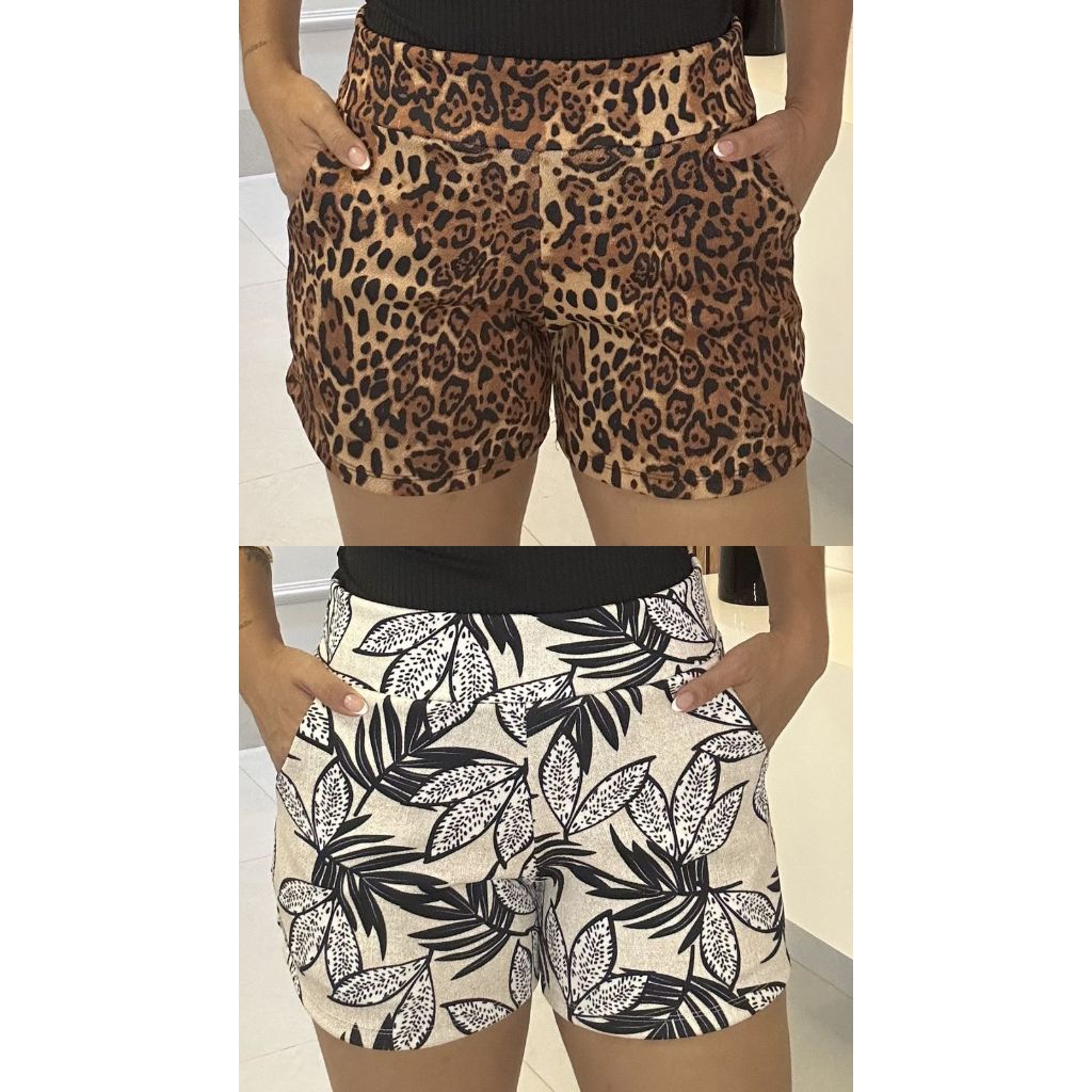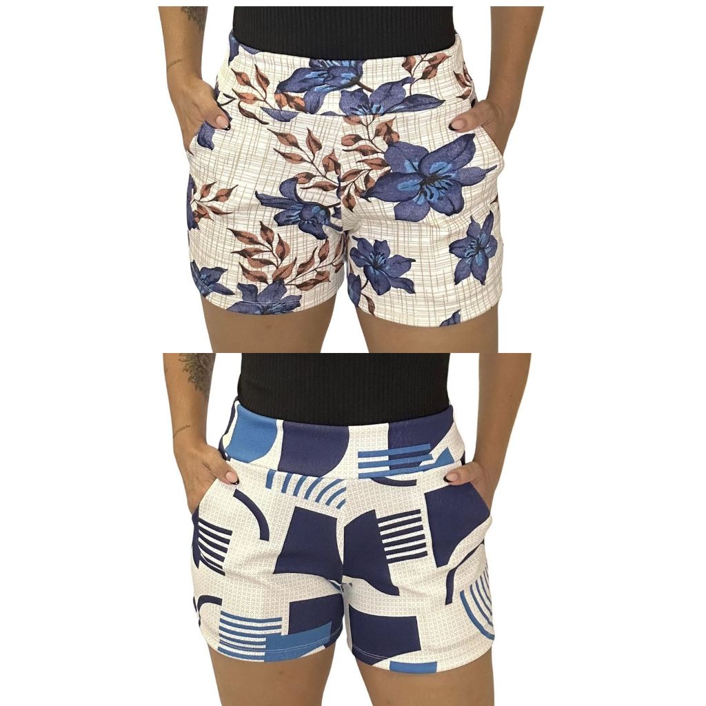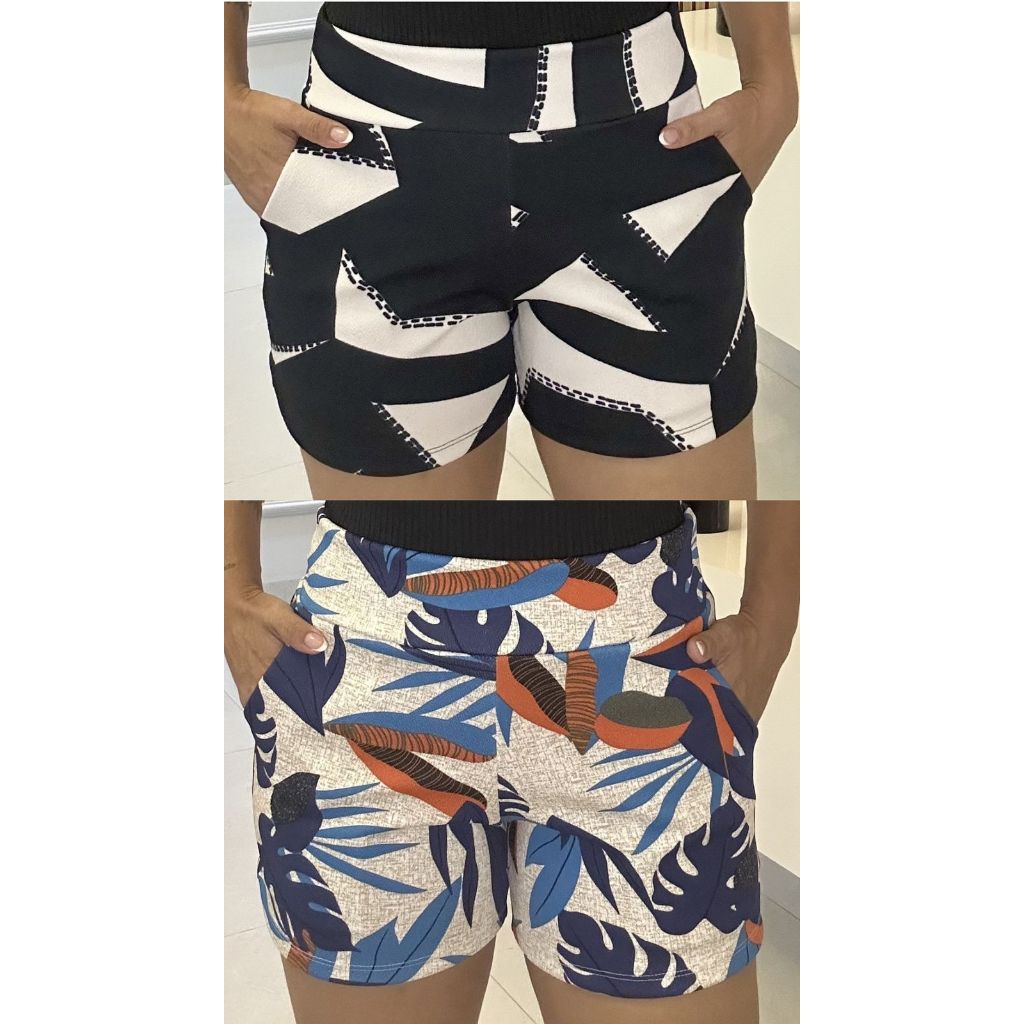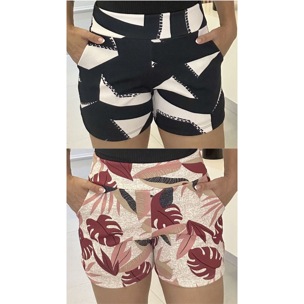 SHORTS FEMININO COM BOLSO DE MALHA NO CREPE ESTAMPADO CURTO COM ELASTANO CONFORTÁVEL CINTURA ALTA BERMUDA KIT DUAS PEÇAS