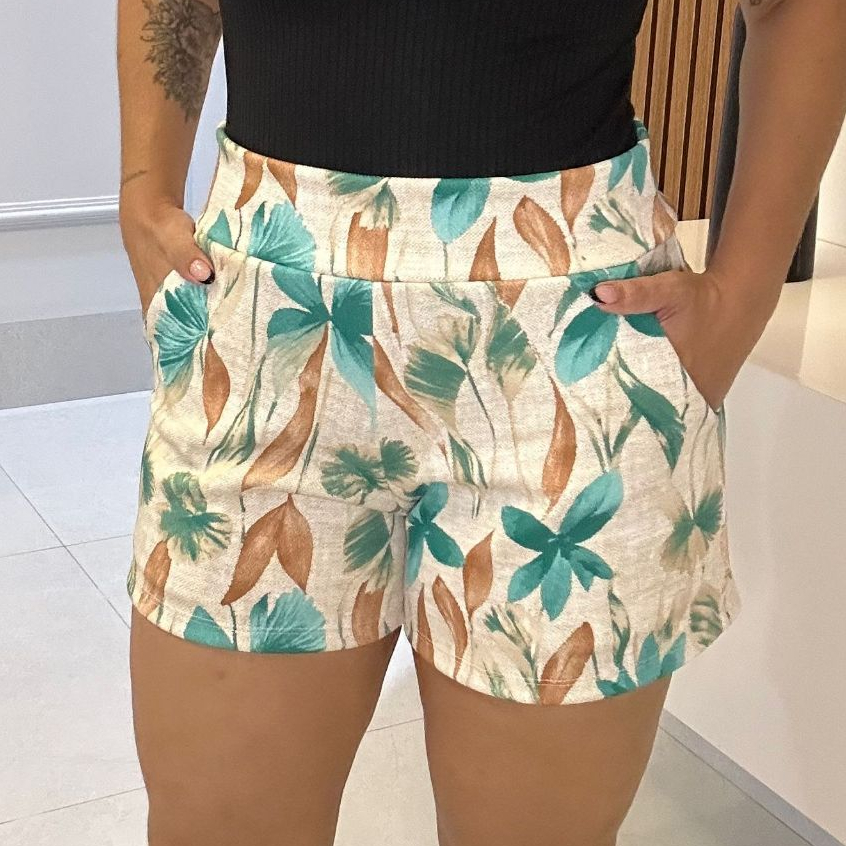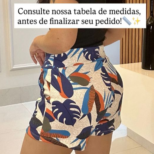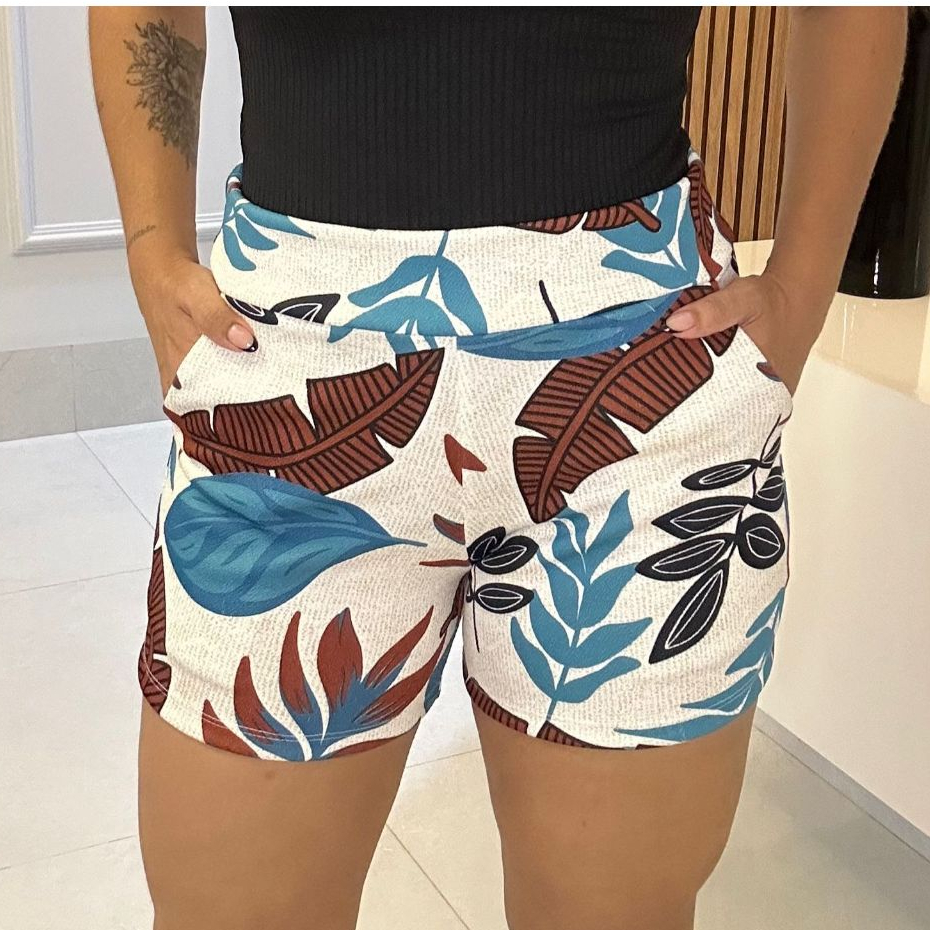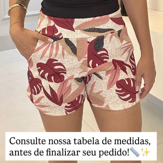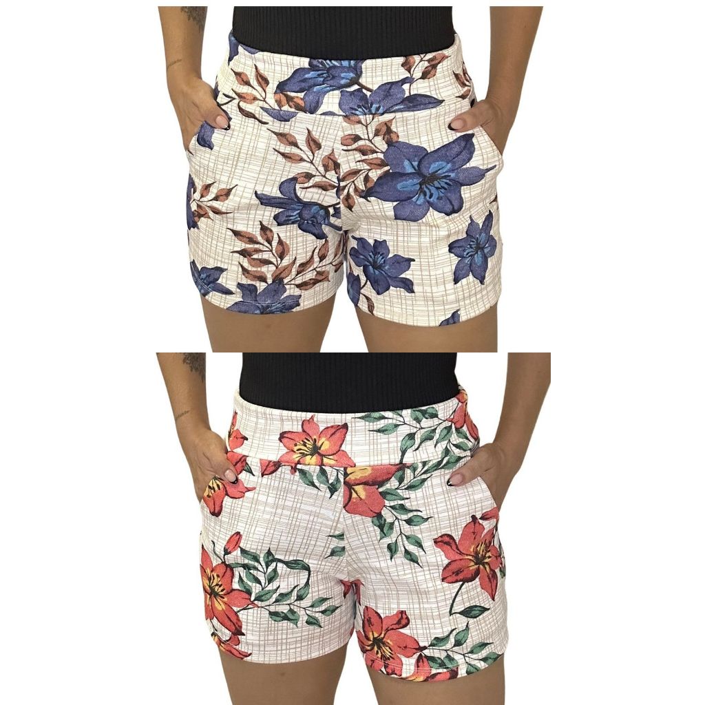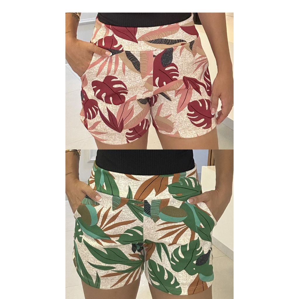 SHORTS FEMININO COM BOLSO DE MALHA NO CREPE ESTAMPADO CURTO COM ELASTANO CONFORTÁVEL CINTURA ALTA BERMUDA KIT DUAS PEÇAS