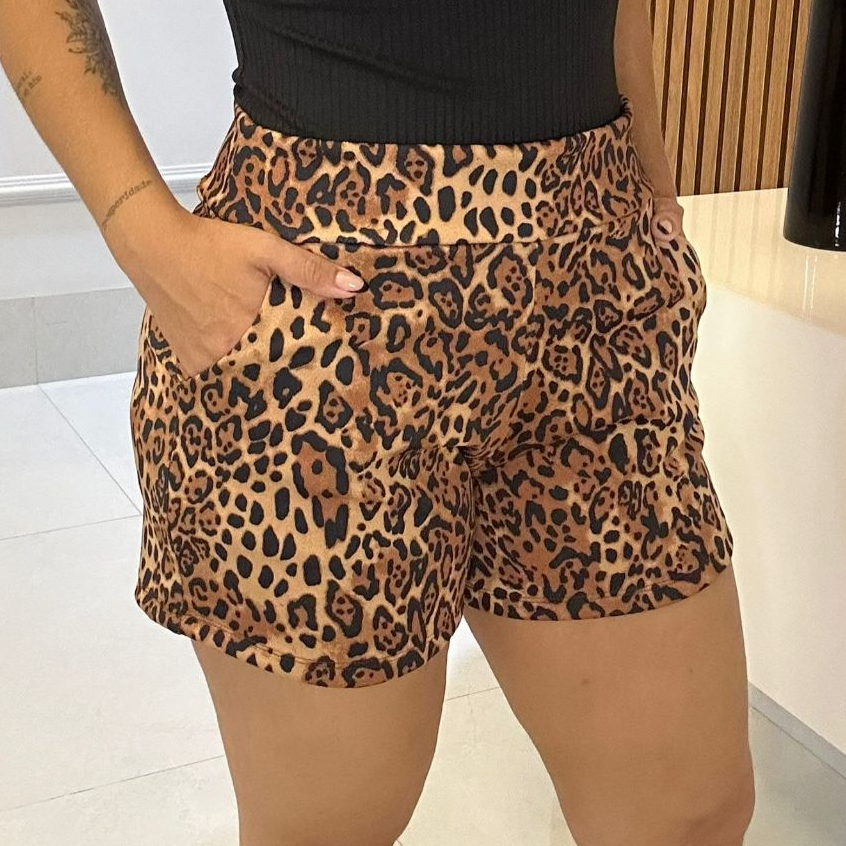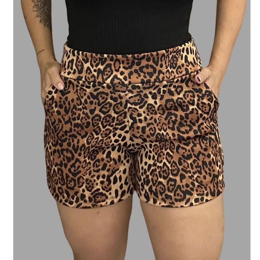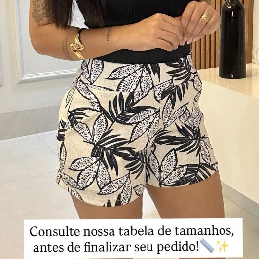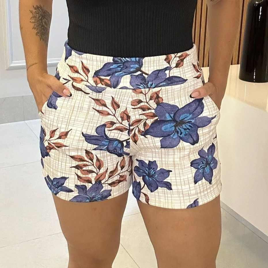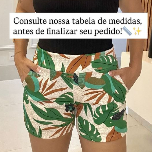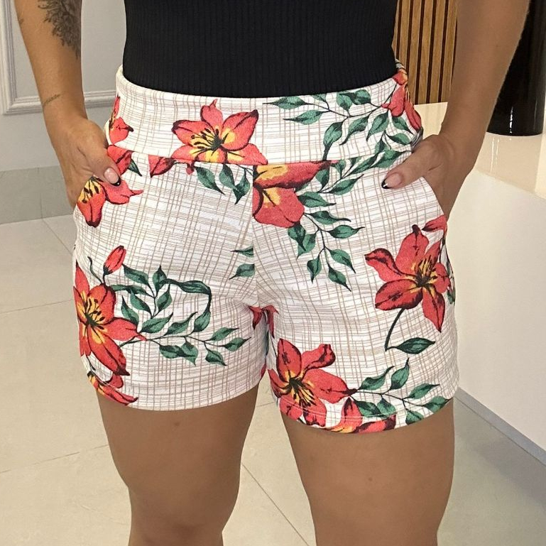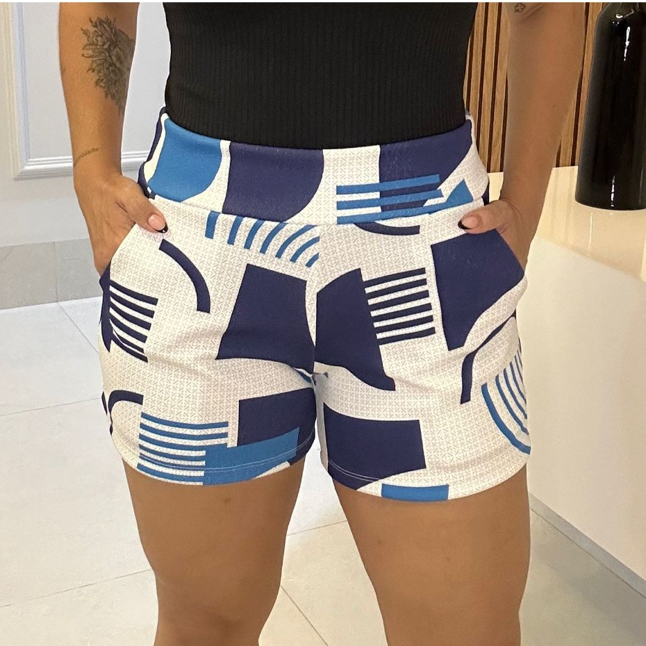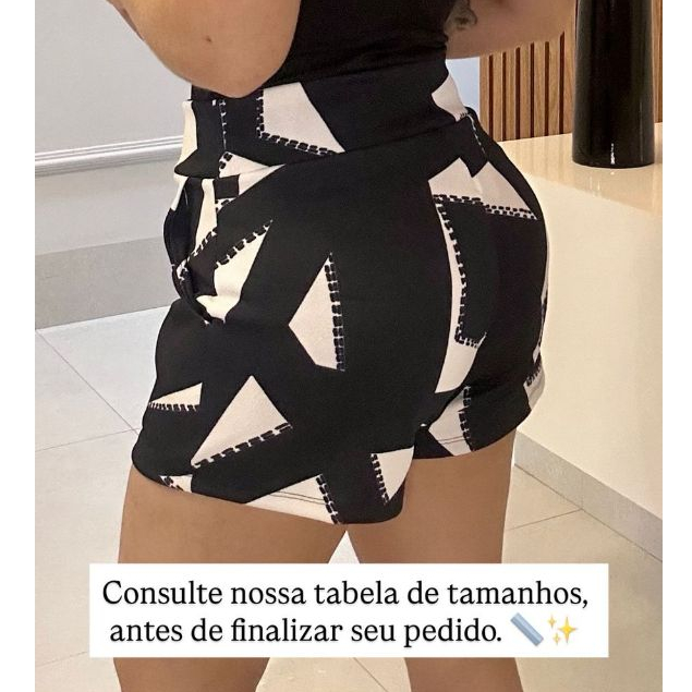 SHORTS FEMININO COM BOLSO DE MALHA NO CREPE ESTAMPADO CURTO COM ELASTANO CONFORTÁVEL CINTURA ALTA BERMUDA KIT DUAS PEÇAS
