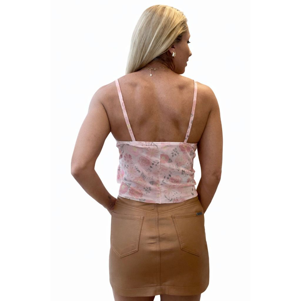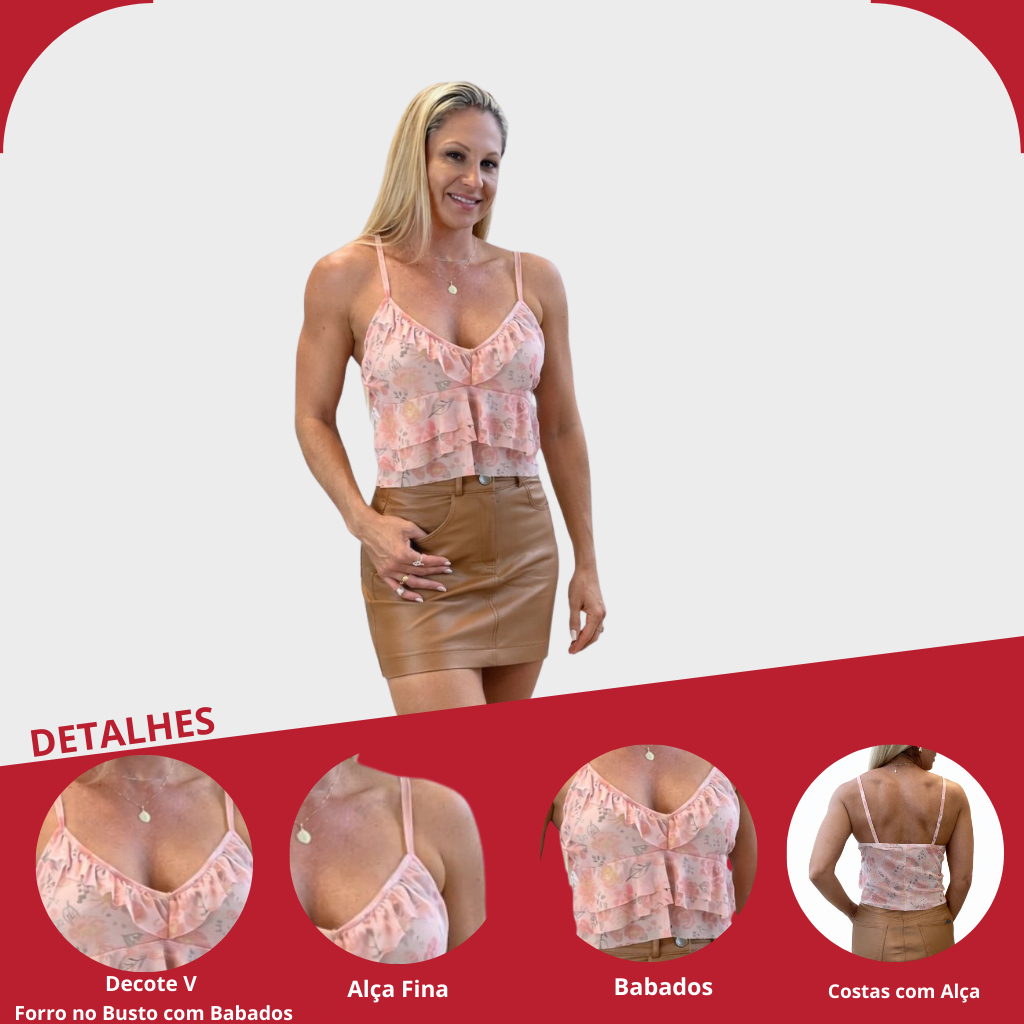 Blusa Cropeed de Tule Floral Decote V Com Forro Alças Finas Babados confortável encontro