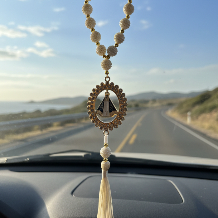 KIT RELIGIOSO Nossa Senhora Aparecida para Carro | Terço Retrovisor + Santinha colável para painel