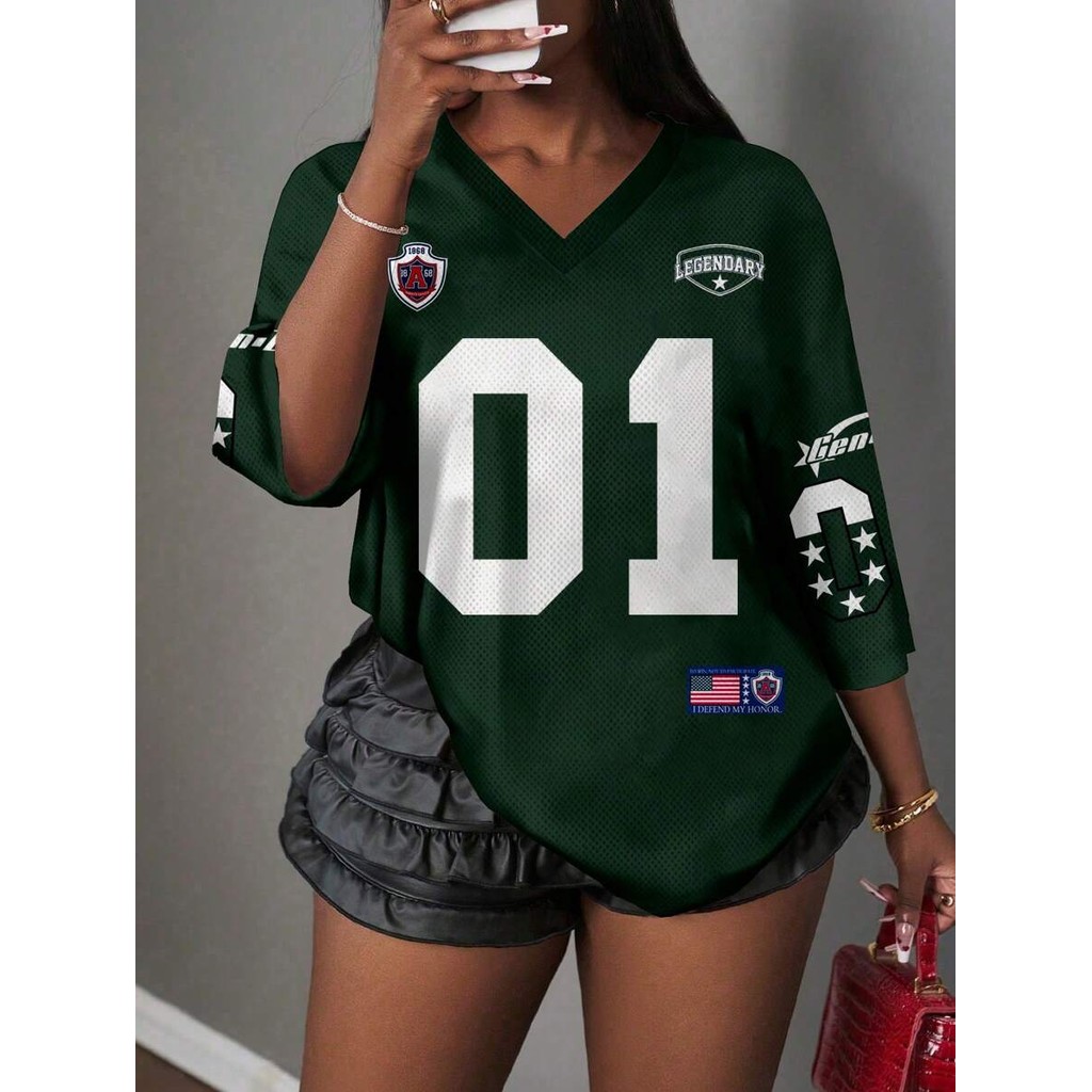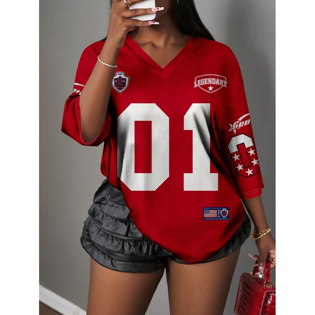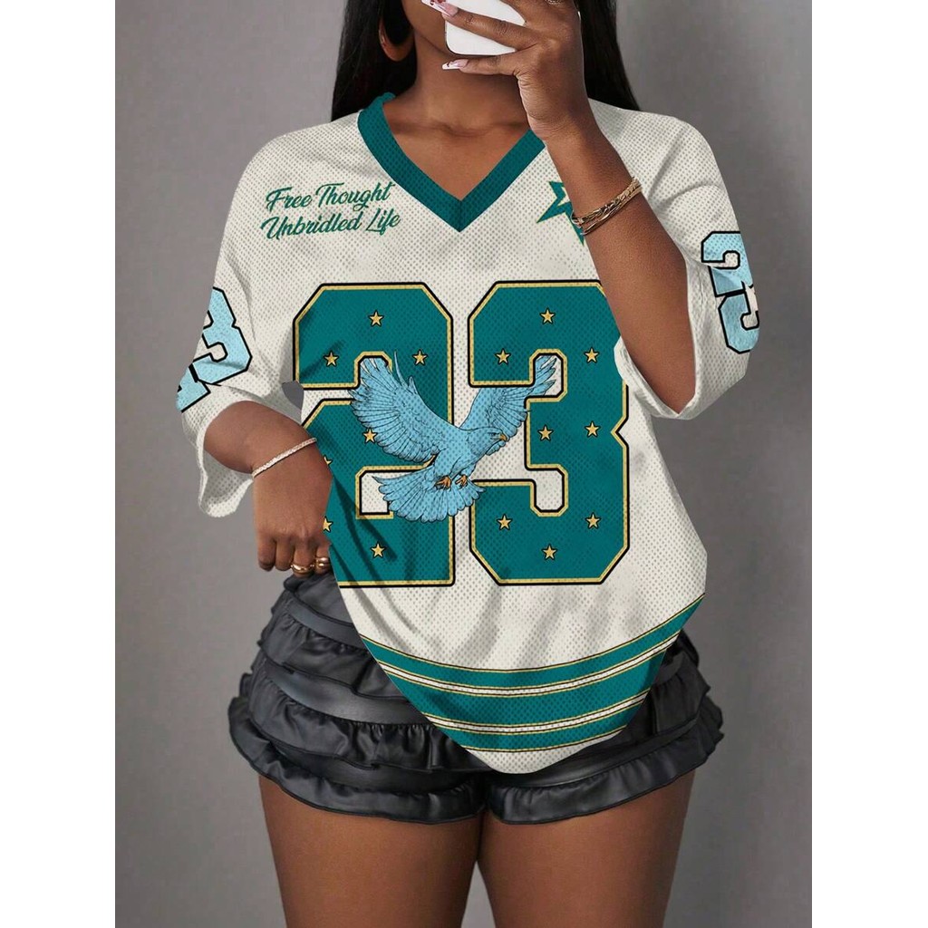 Camiseta Casual Minimalista Com Letras E Números Decote Em V Para Mulheres Plus Size , Adequada O Verão