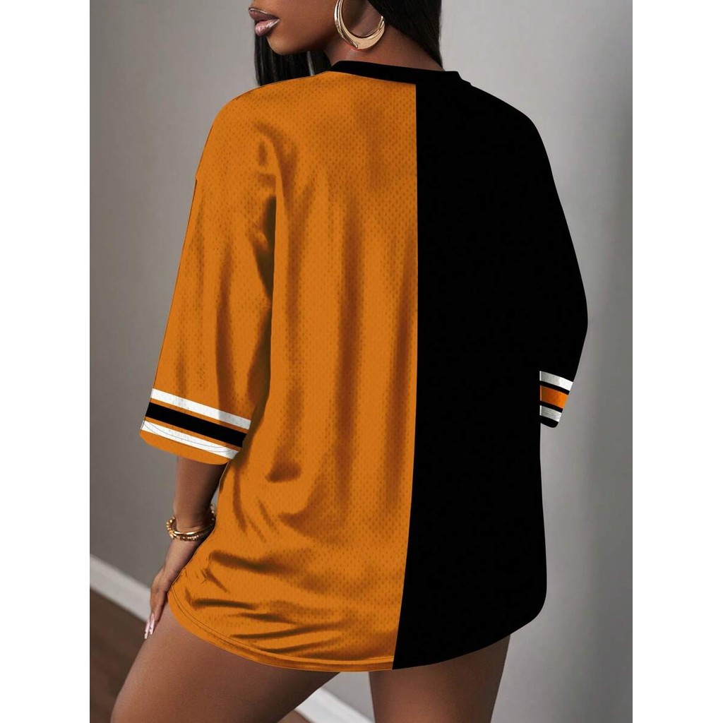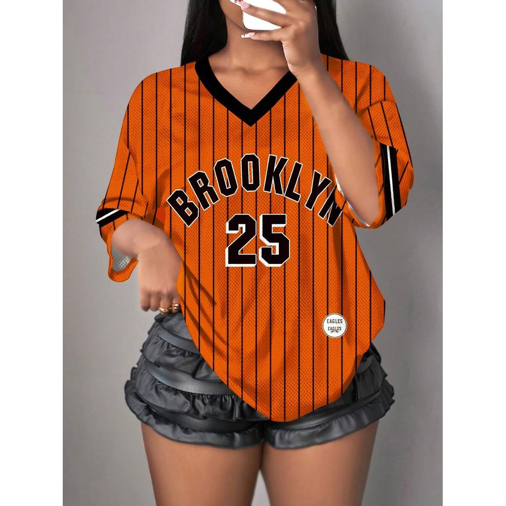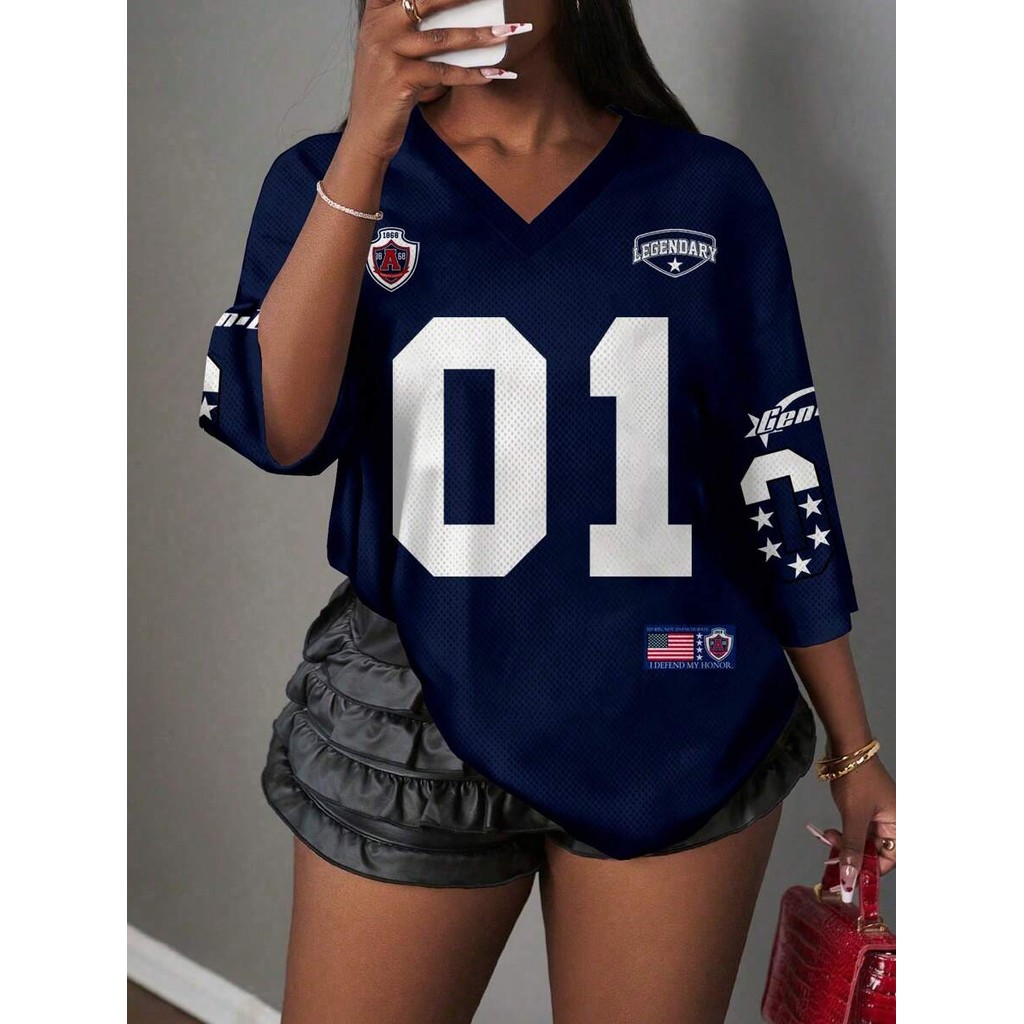 Camiseta Casual Minimalista Com Letras E Números Decote Em V Para Mulheres Plus Size , Adequada O Verão