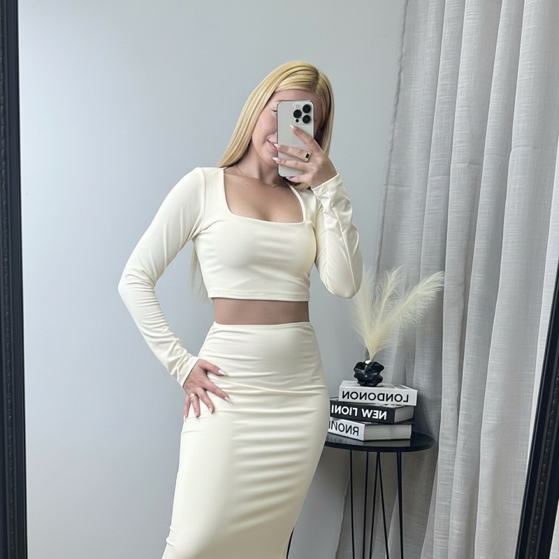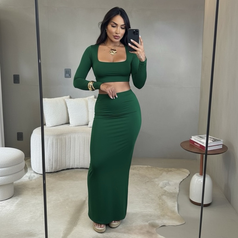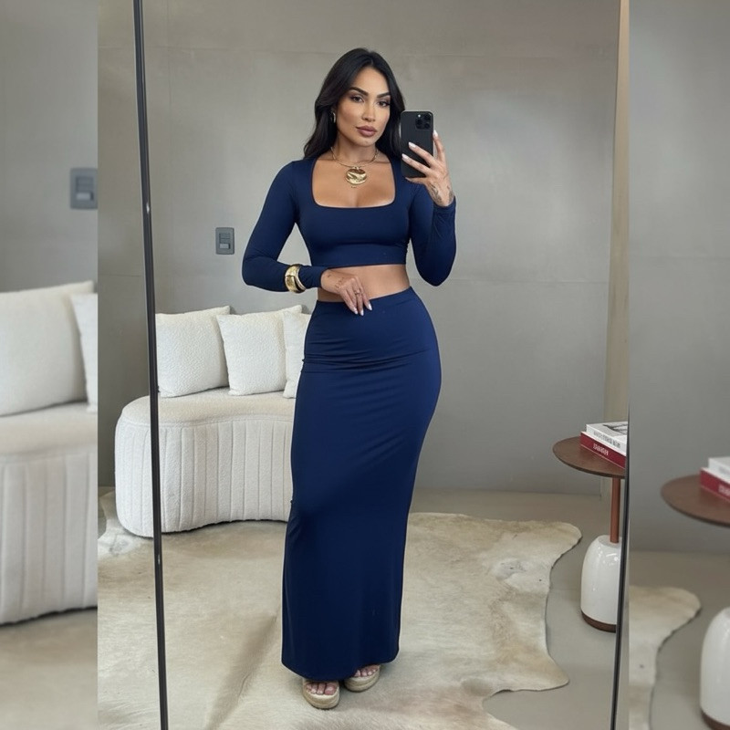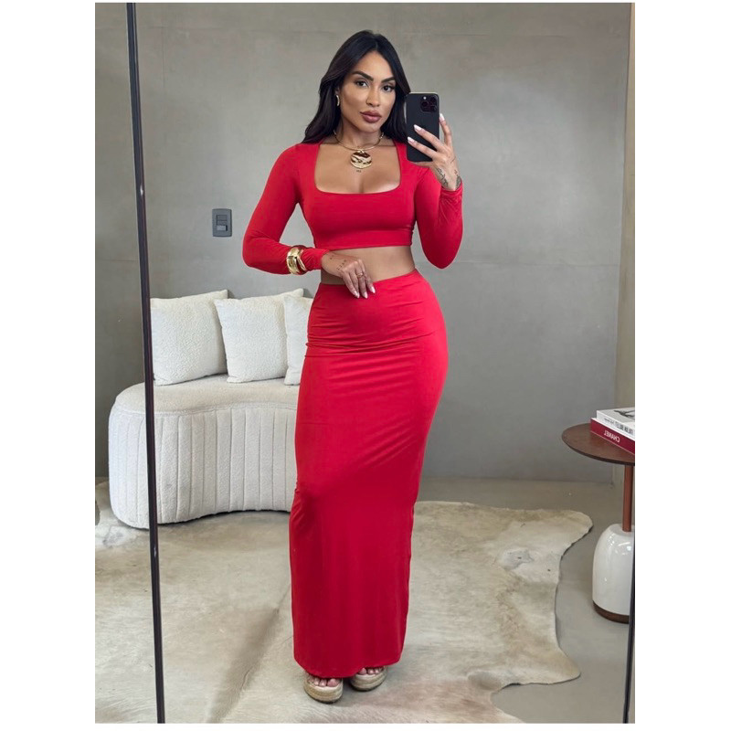 Conjunto Feminino Cropped Manga Longa e Saia Midi Tubinho Suplex Festa, Balada, Outono moda gringa Sexy, Elegante slim