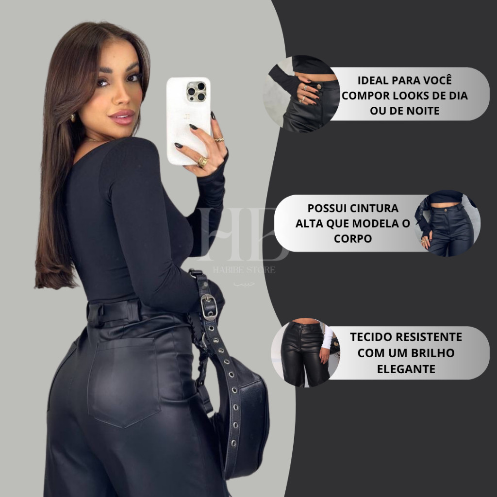 Calça Feminina Couro PU Sintético Wide Leg Pantalona com Bolso Zíper Botão Cintura Alta Moda Gringa Blogueira