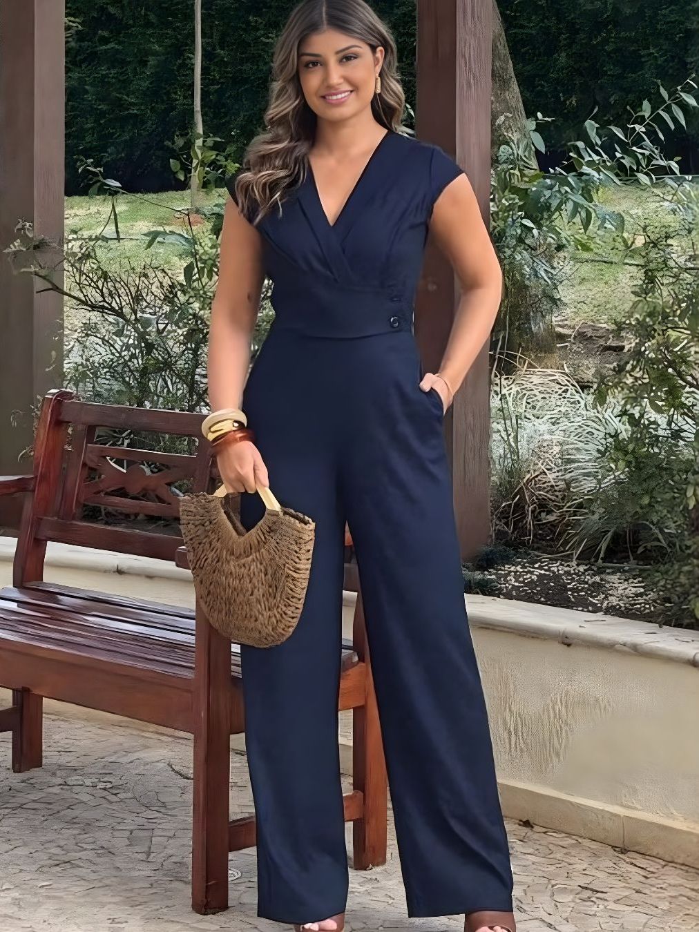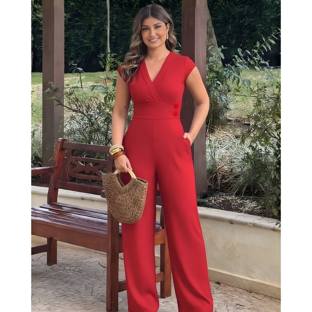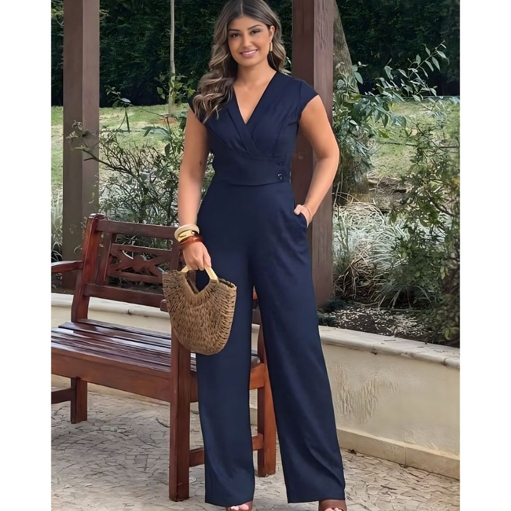 Macacão Longo Feminino Elegante Social Alfaiataria Decote V Manga Curta Com Bolso Festa Formatura