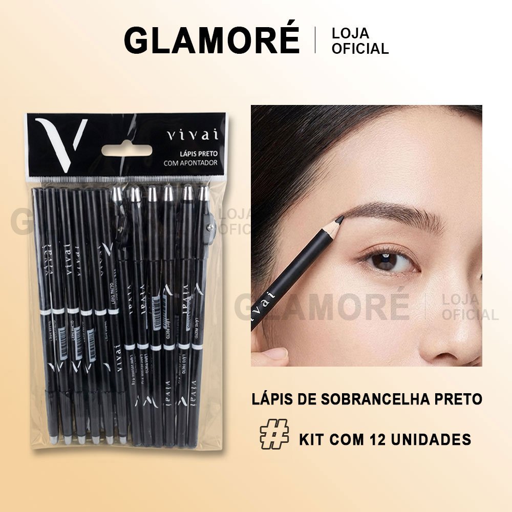Kit 12 Lápis de Sobrancelha Vivai Preto | Com Apontador | Traço Preciso