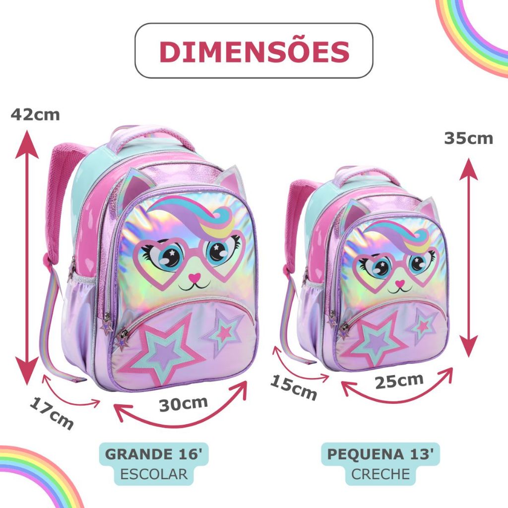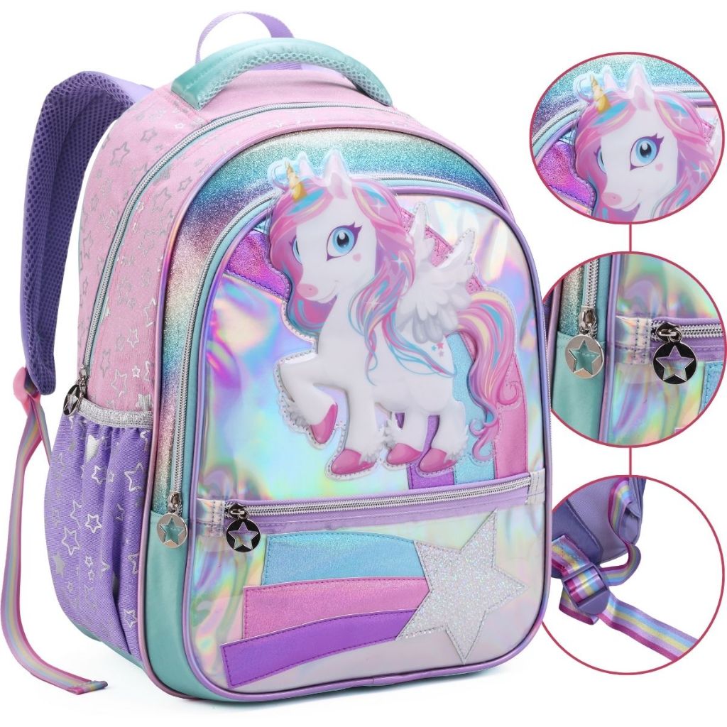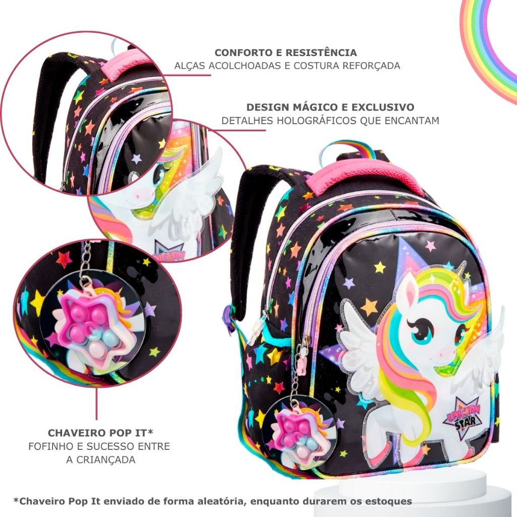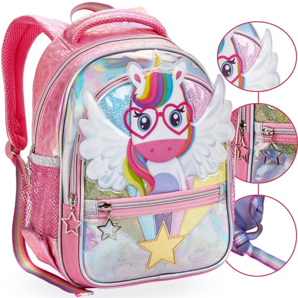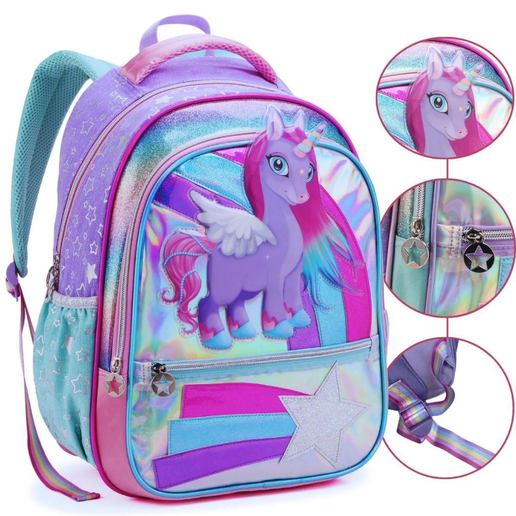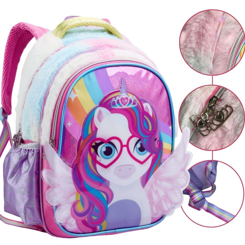 Mochila Infantil Escolar Criança Mini e Grande Menina Unicórnio Reforçada Brilhante Asas 3D Costas