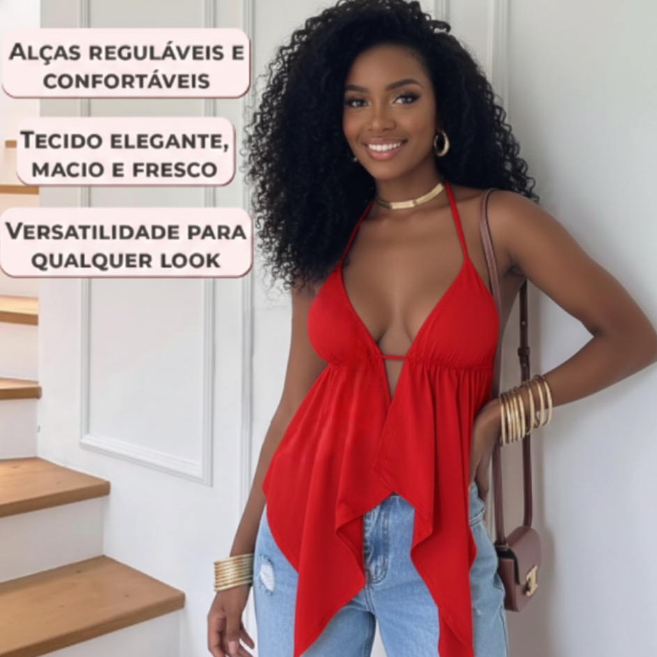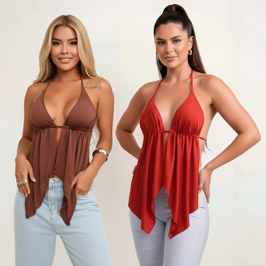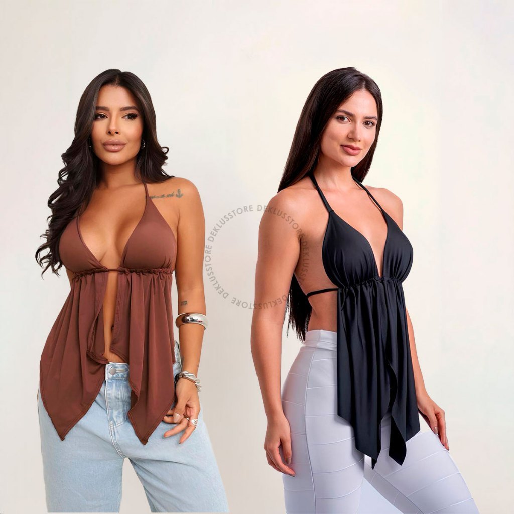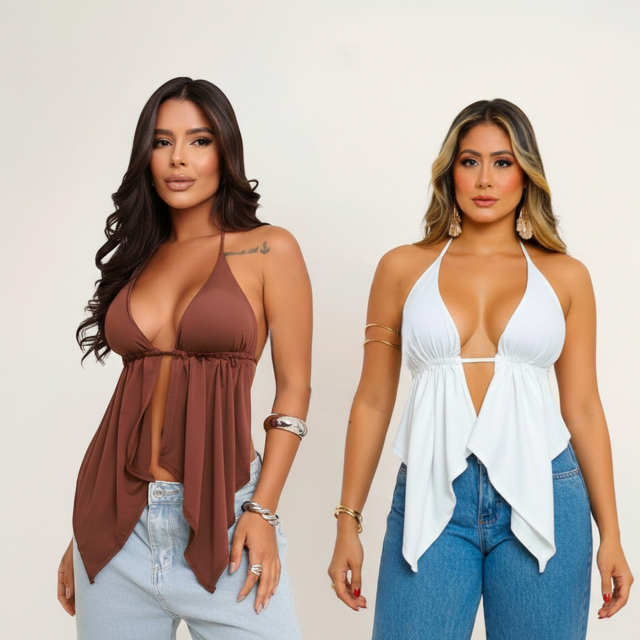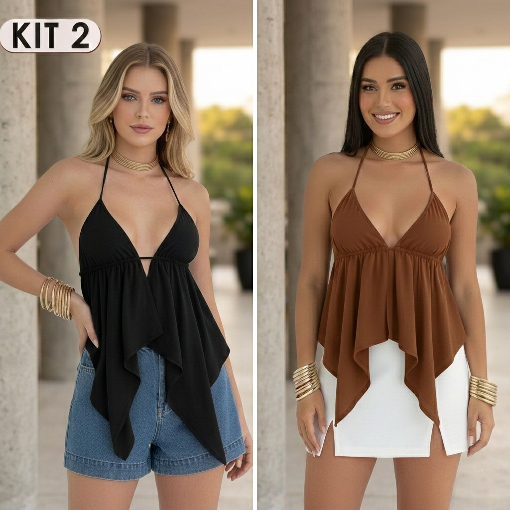 Kit 2 - Top Cropped Feminino Malibu Babado Costas Nuas Cortininha Bata Tendência Boho Chic