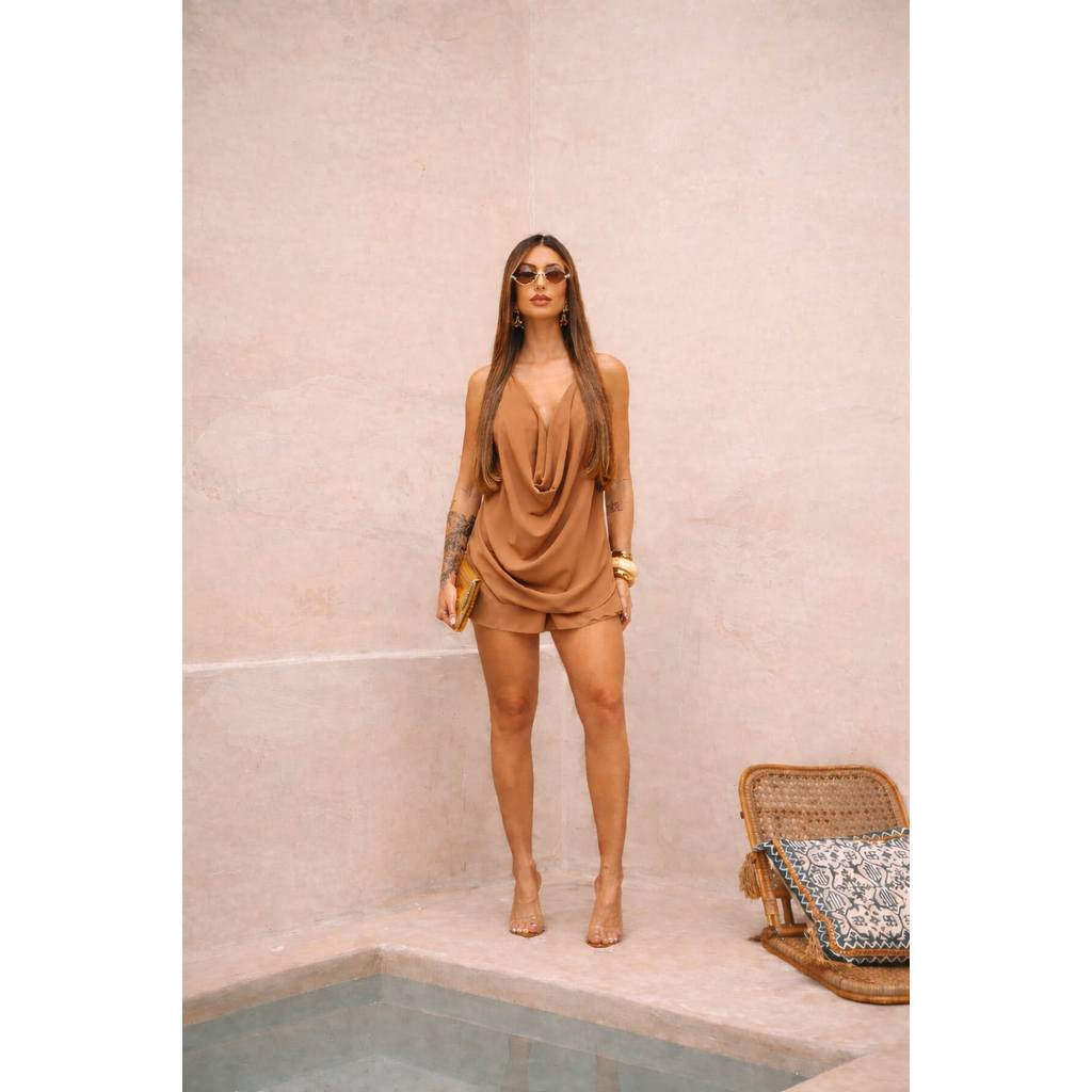 Conjunto Frente Única Com Saia Short e Amarração no Pescoço