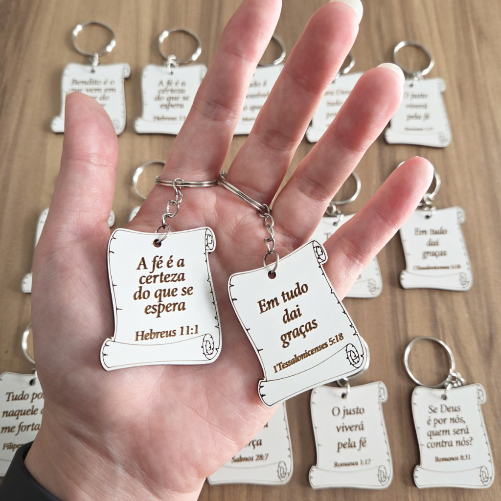 Kit Chaveiros Versículos Bíblicos Modelo Pergaminho em MDF Branco Ótimo para lembrancinha Cristã