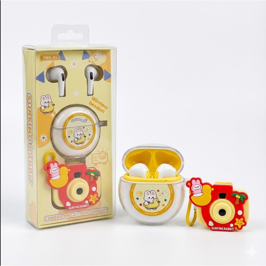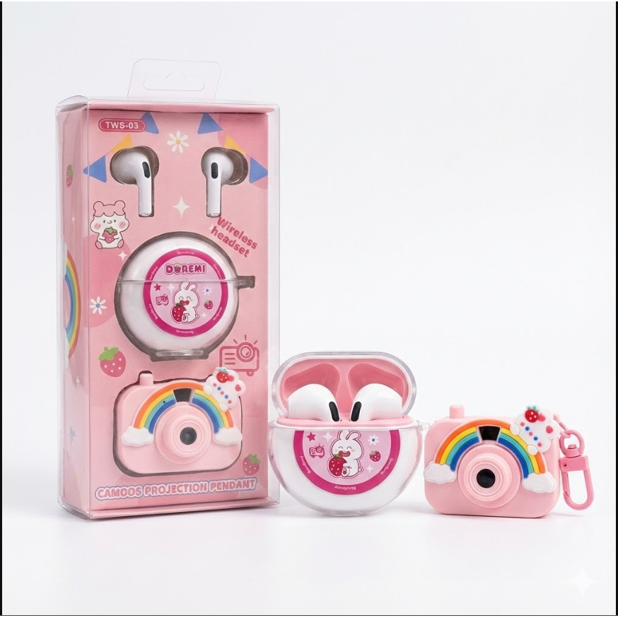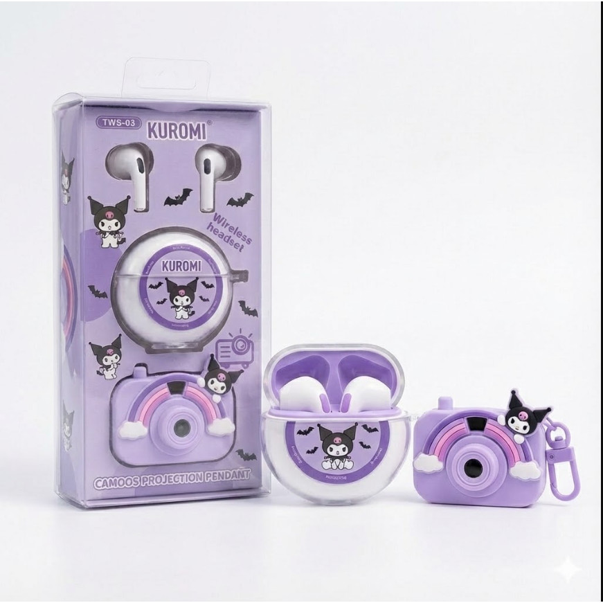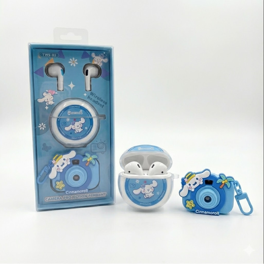 Fone de Ouvido Bluetooth TWS Sanrio com Projeção - Hello Kitty Kuromi Cinnamoroll - Design Câmera Retrô Kawaii