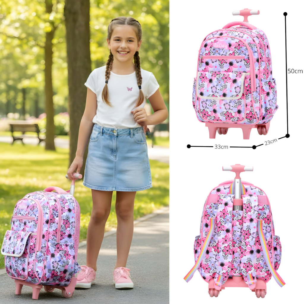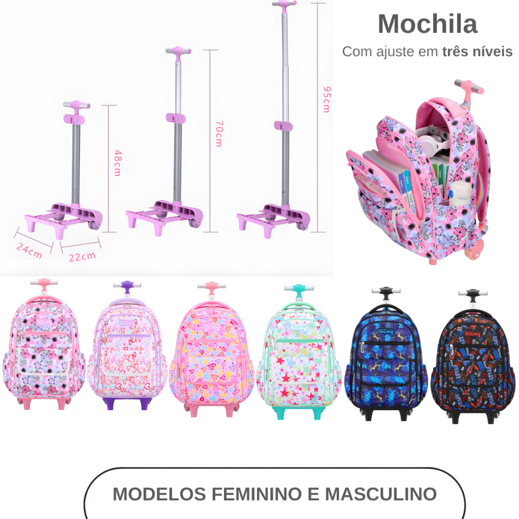 Mochila Escolar Infantil com Rodinhas Carrinho Ajustável Estampada Grande Capacidade