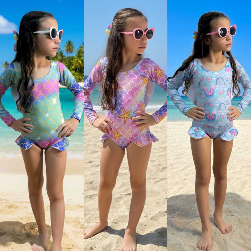 Maiô Infantil Menina Juvenil Manga Longa Estampado Praia Piscina Proteção UV 1, 2, 4, 6, 8 e 10 Anos