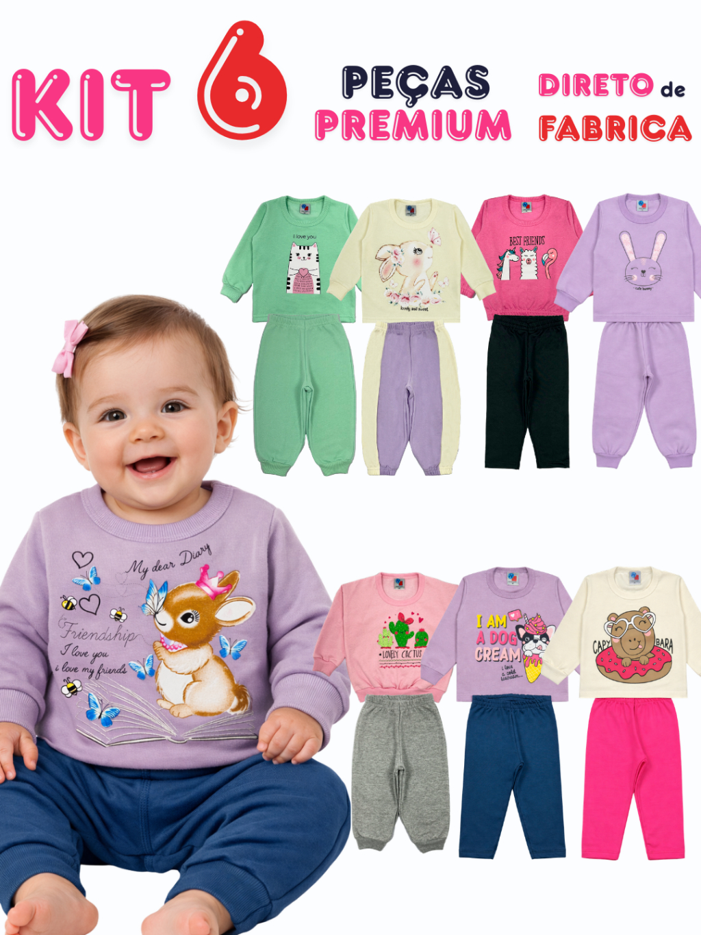Kit 6 Peças Bebê Menina Inverno Moletom Felpado 3 Conjuntos Roupa Bebê Frio P M G 1 a 9 Meses