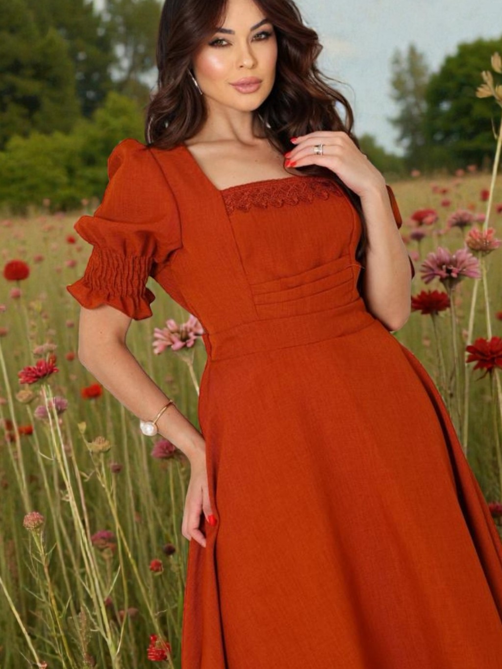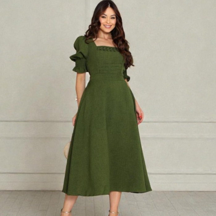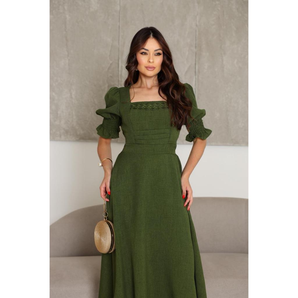 Vestido Midi Bordô Romântico Blogueira Moda Evangélica Decote Quadrado Manga Bufante