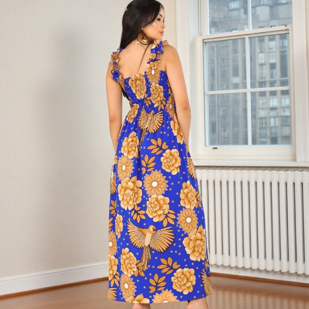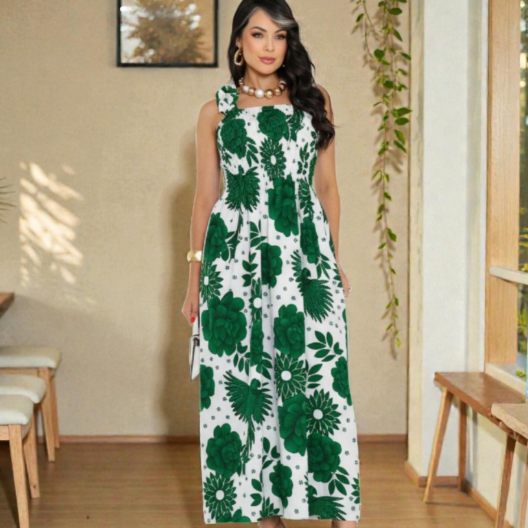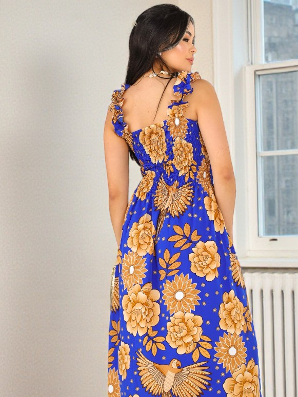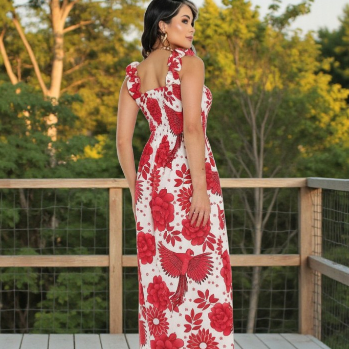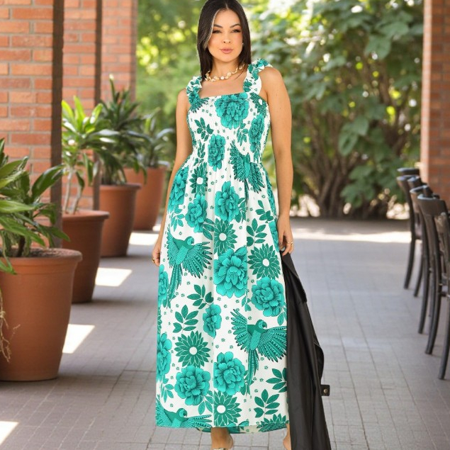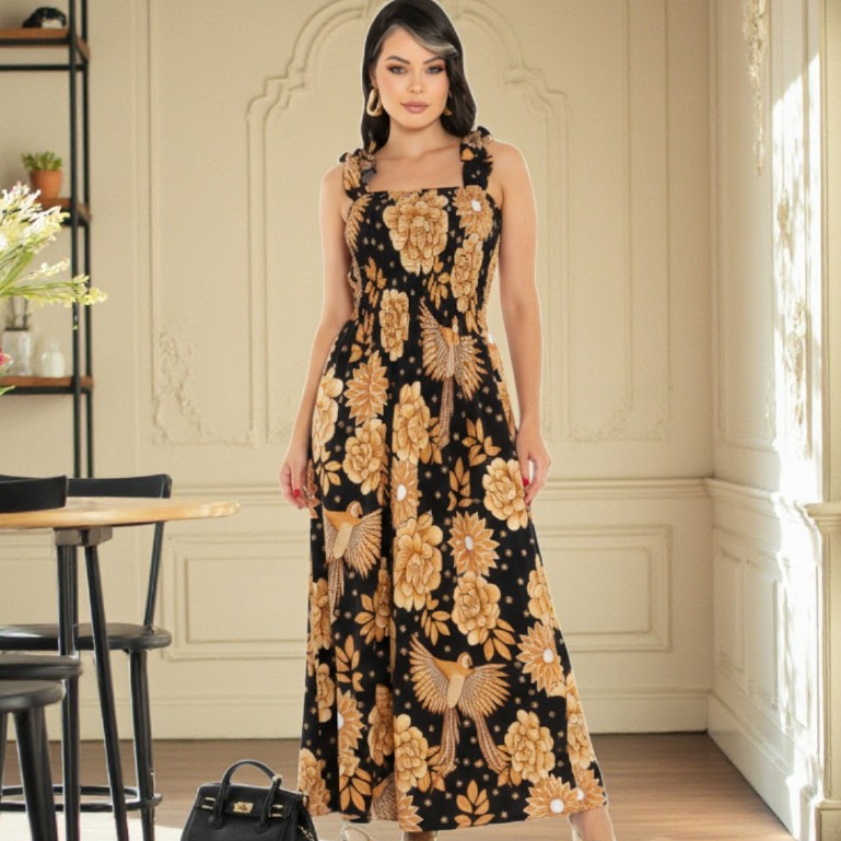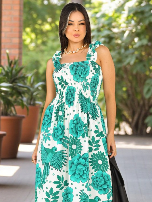 Vestido Longo Feminino Estampa Premium Alças de Babados Charme Edição Luxo Elegamte