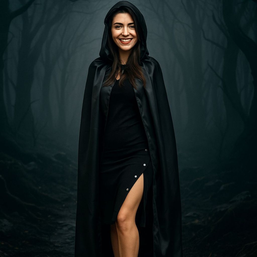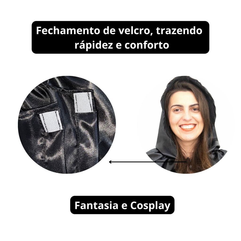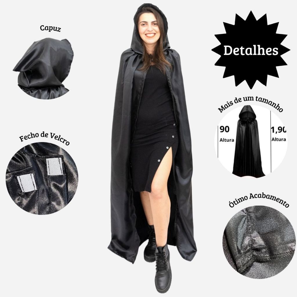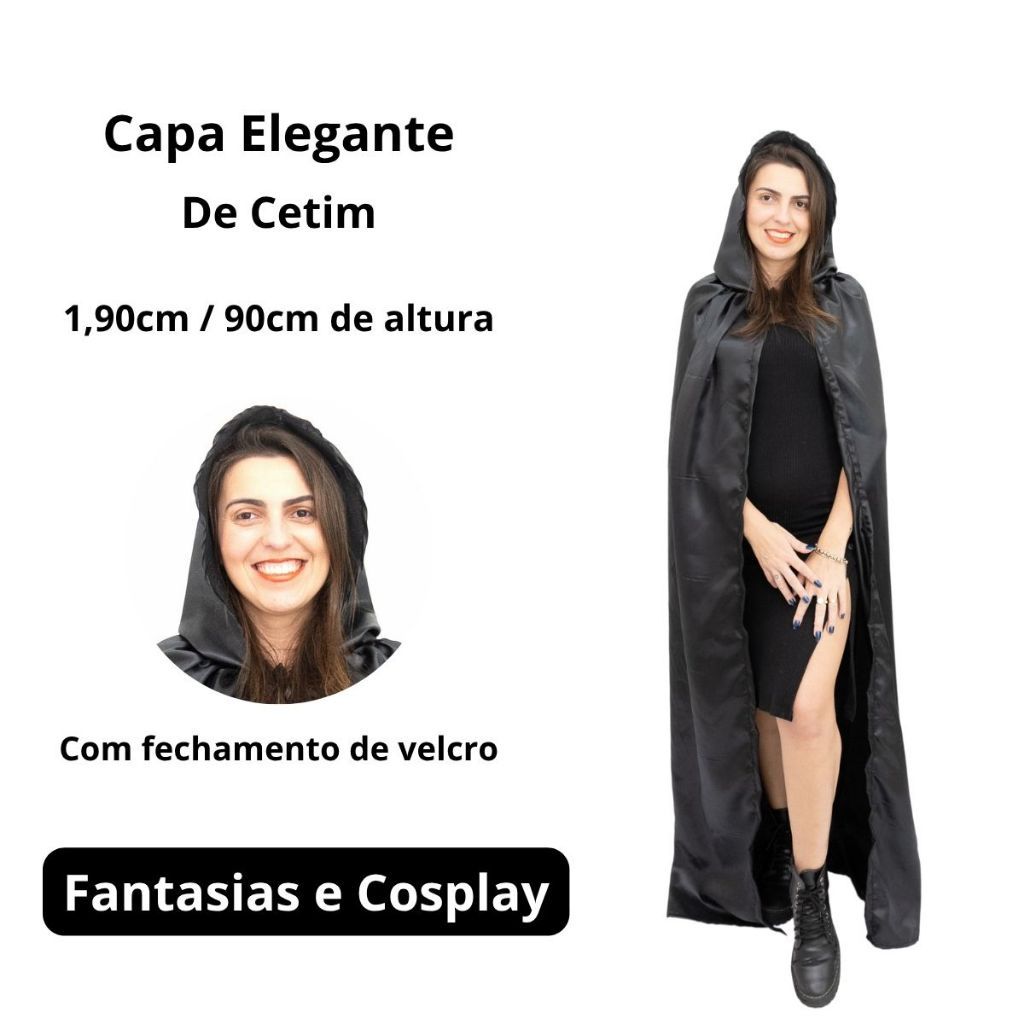 Capa Preta com Capuz Cetim Brilhante – Ideal para Cosplay, Teatro, Festa à Fantasia e Ensaio Fotográfico