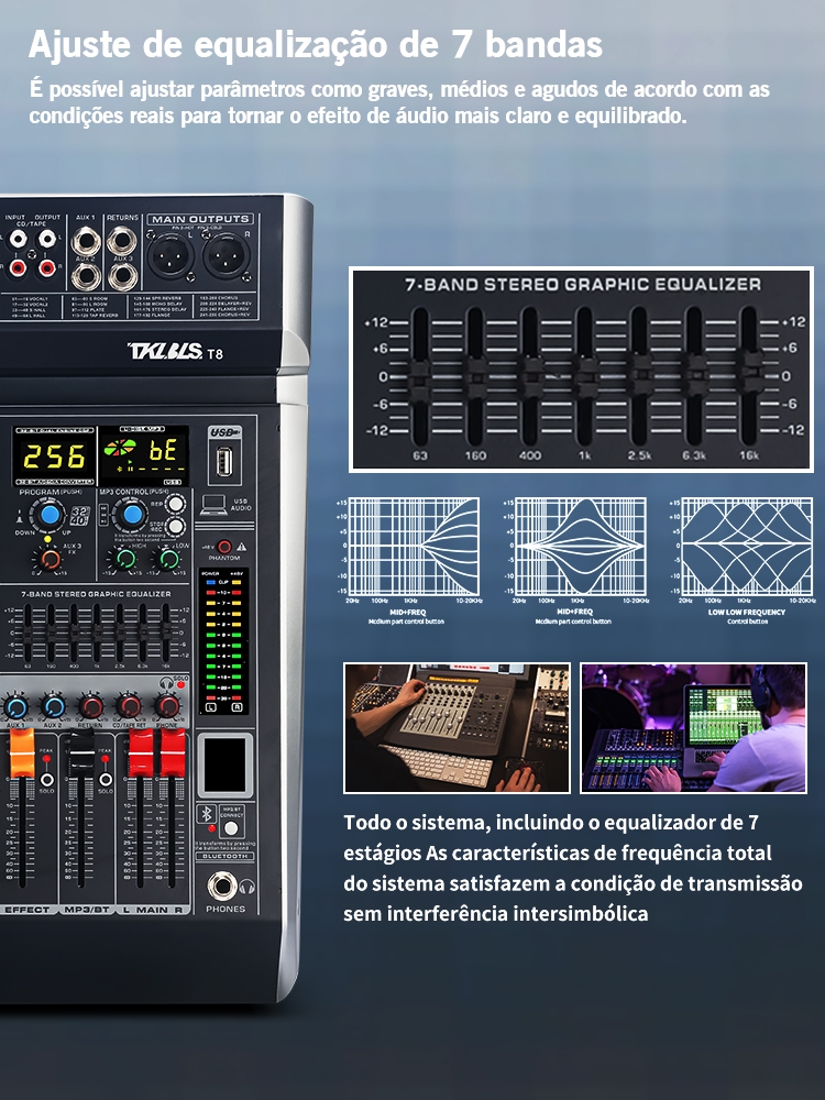 T8 Mesa De Som 8 Canais Mixer De áudio Phantom 48+v Com Atraso E Efeitos De Som Bluetooth USB Elétrico Tela LCD