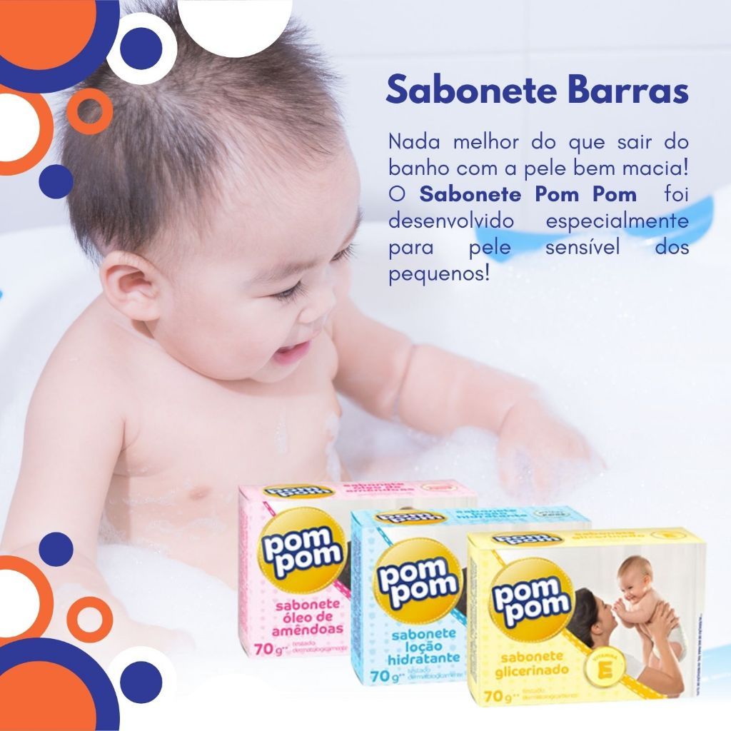 6x Sabonete Infantil em Barra Glicerinado Pom Pom 70g - Hidratação