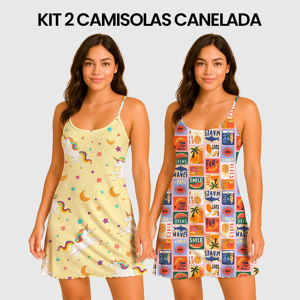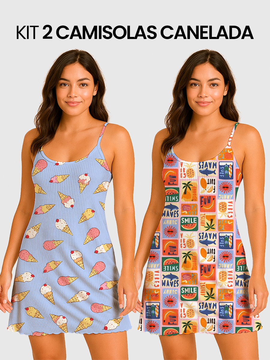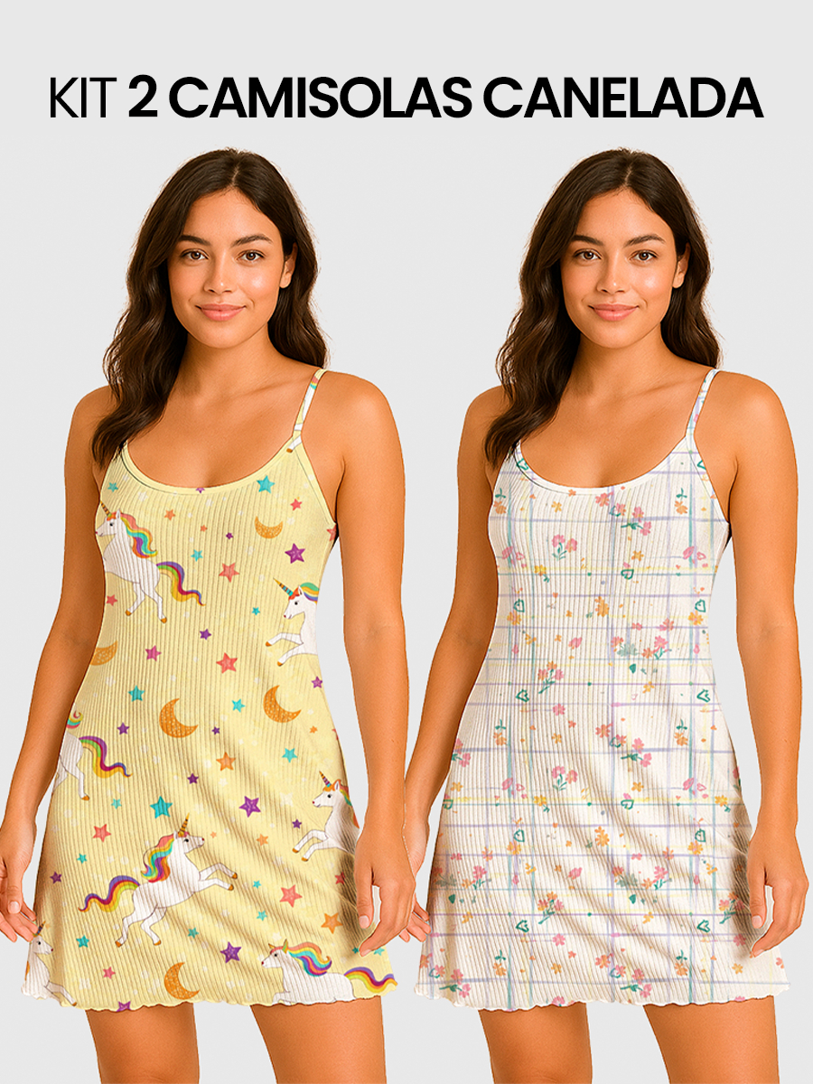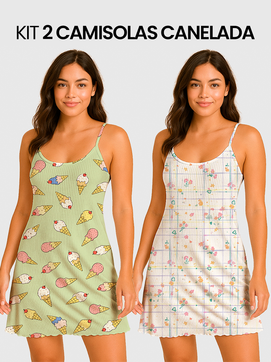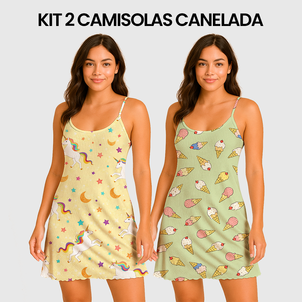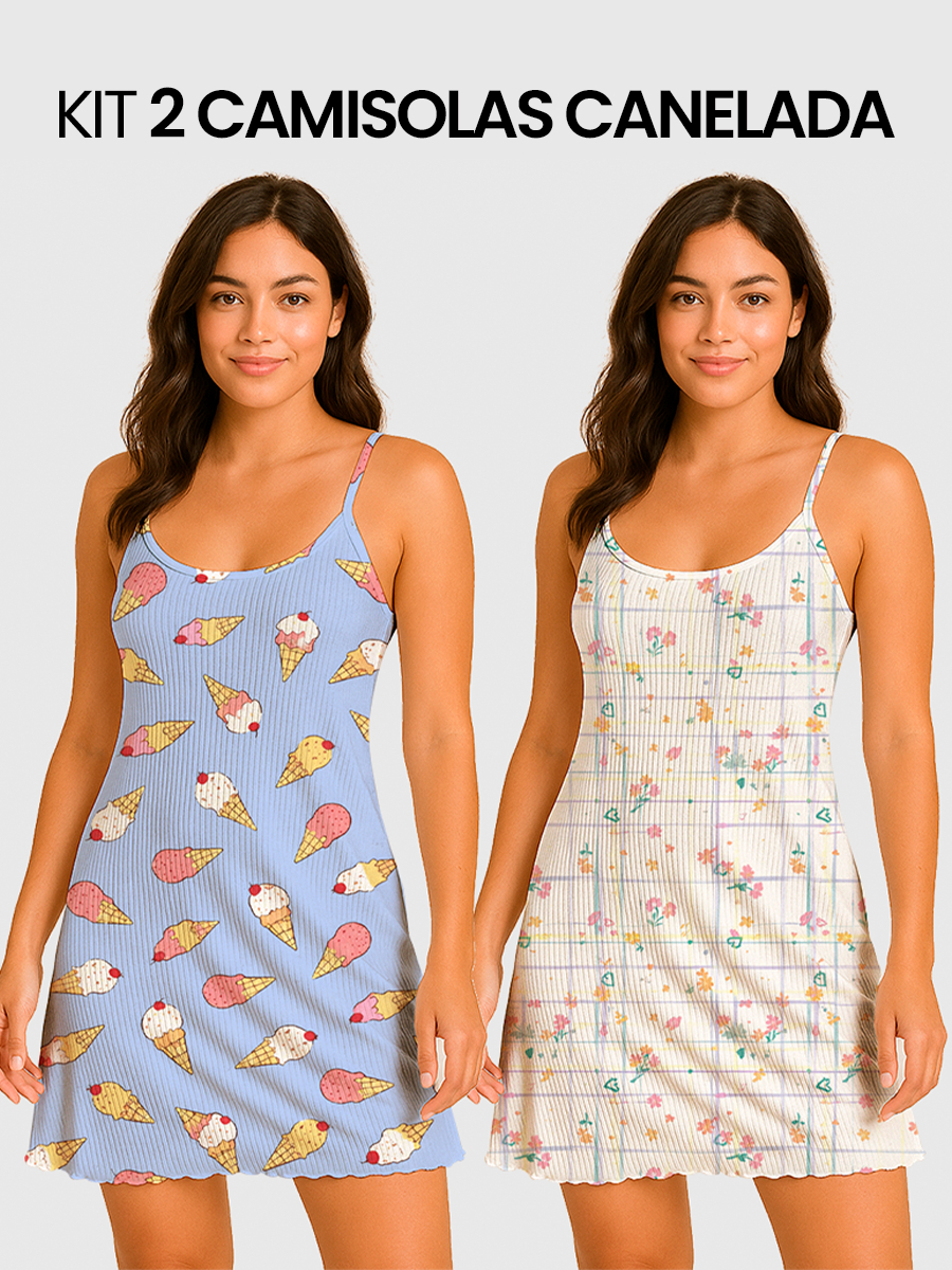 KIT 2 Camisolas Pijama Feminino Estampada Tecido em Suede Canelado - P, M, G, GG