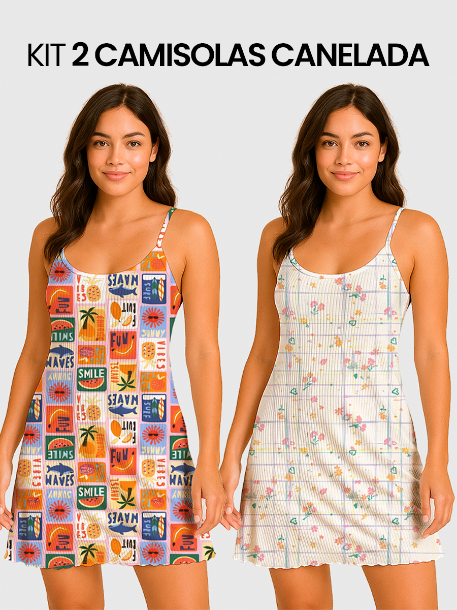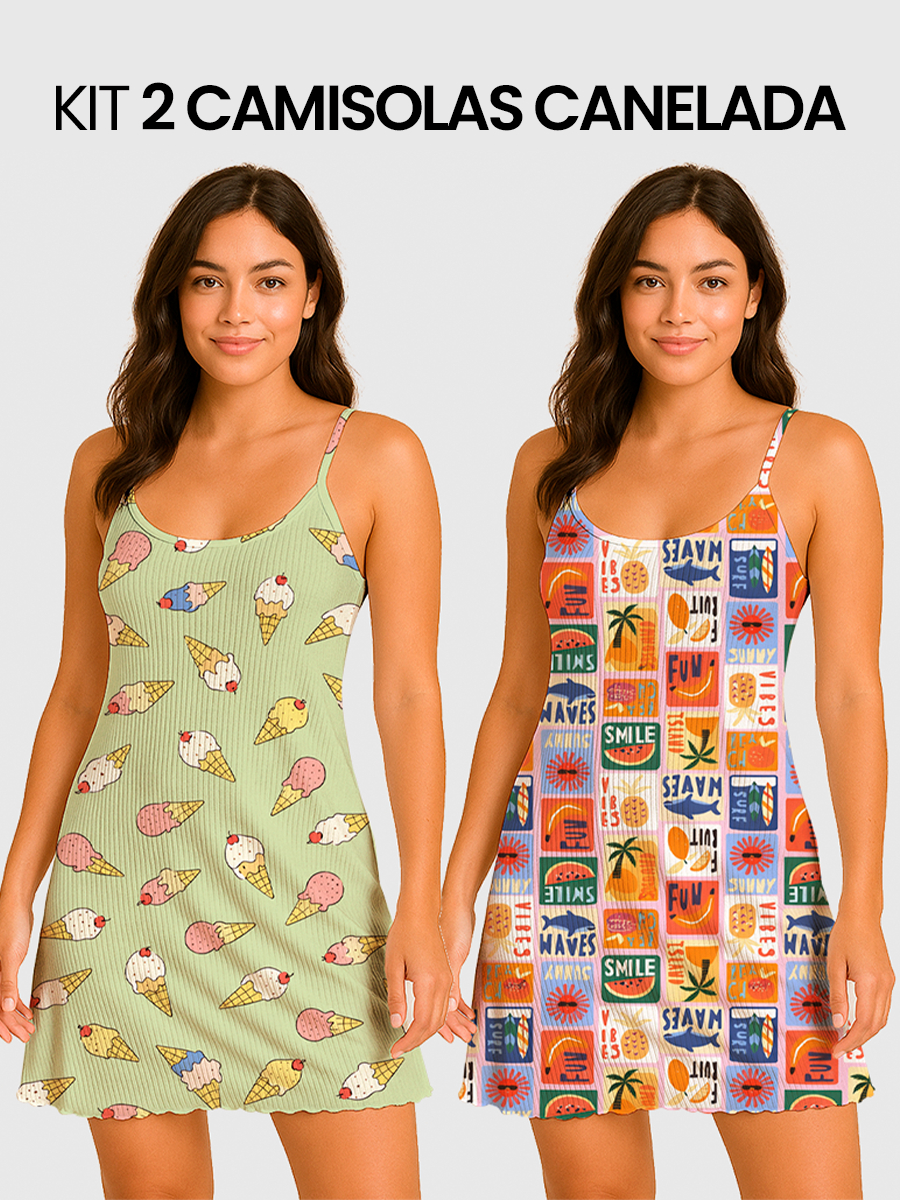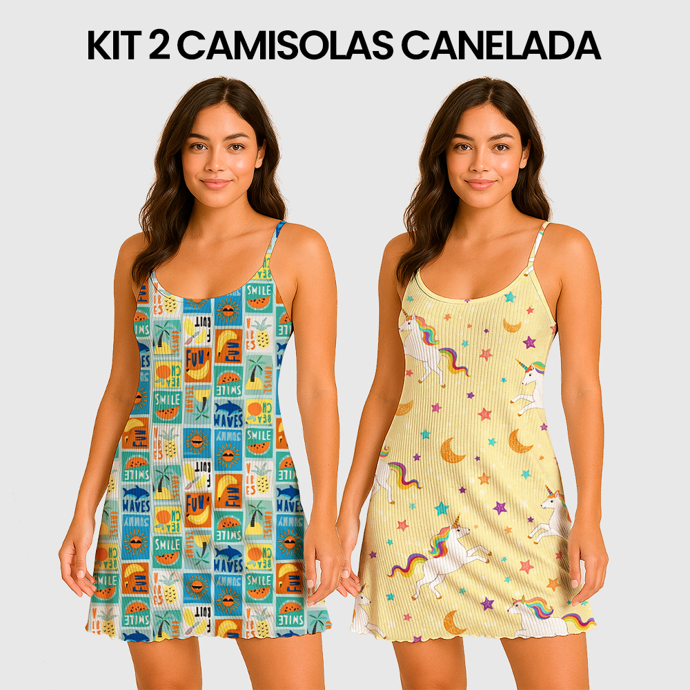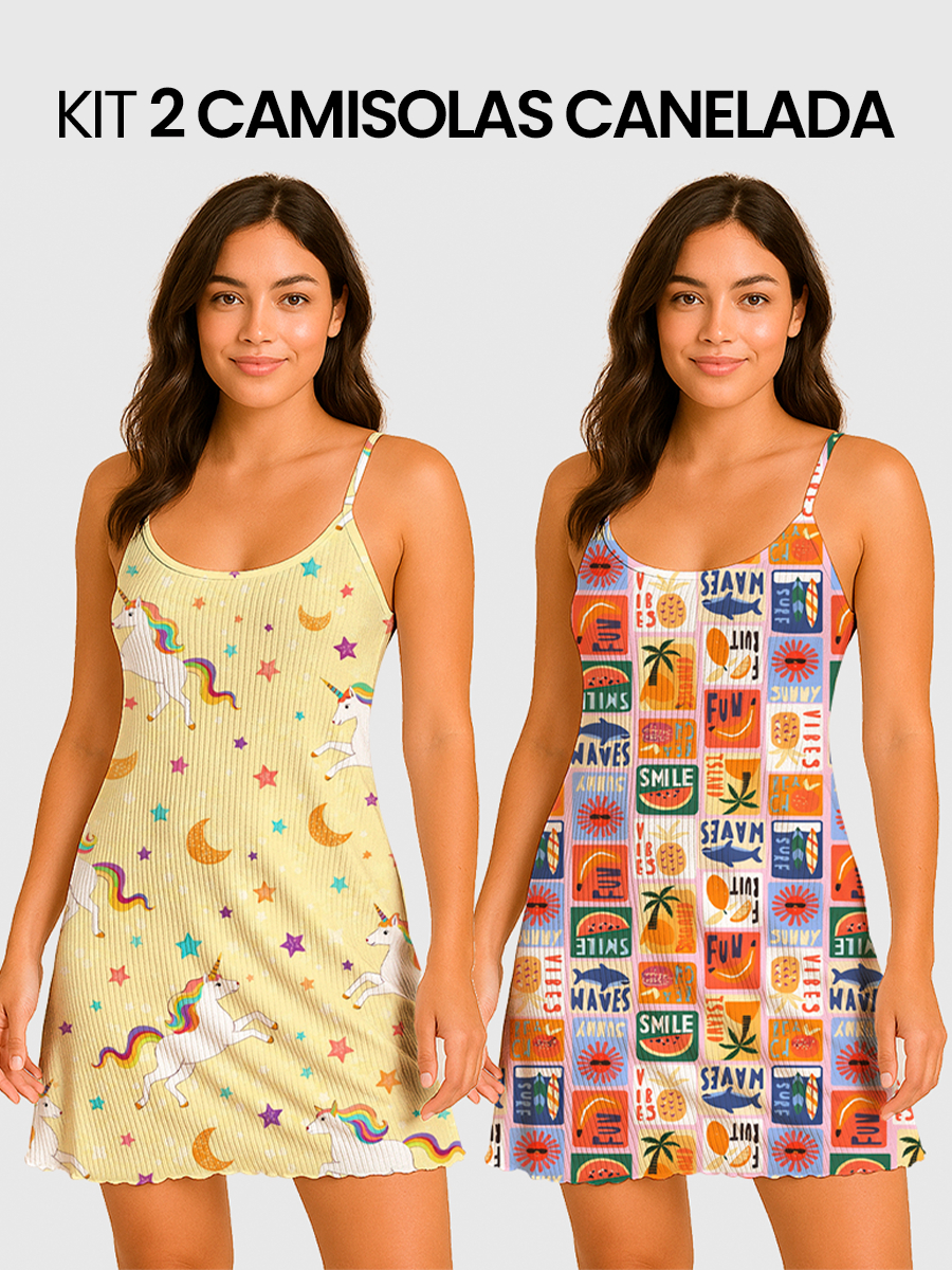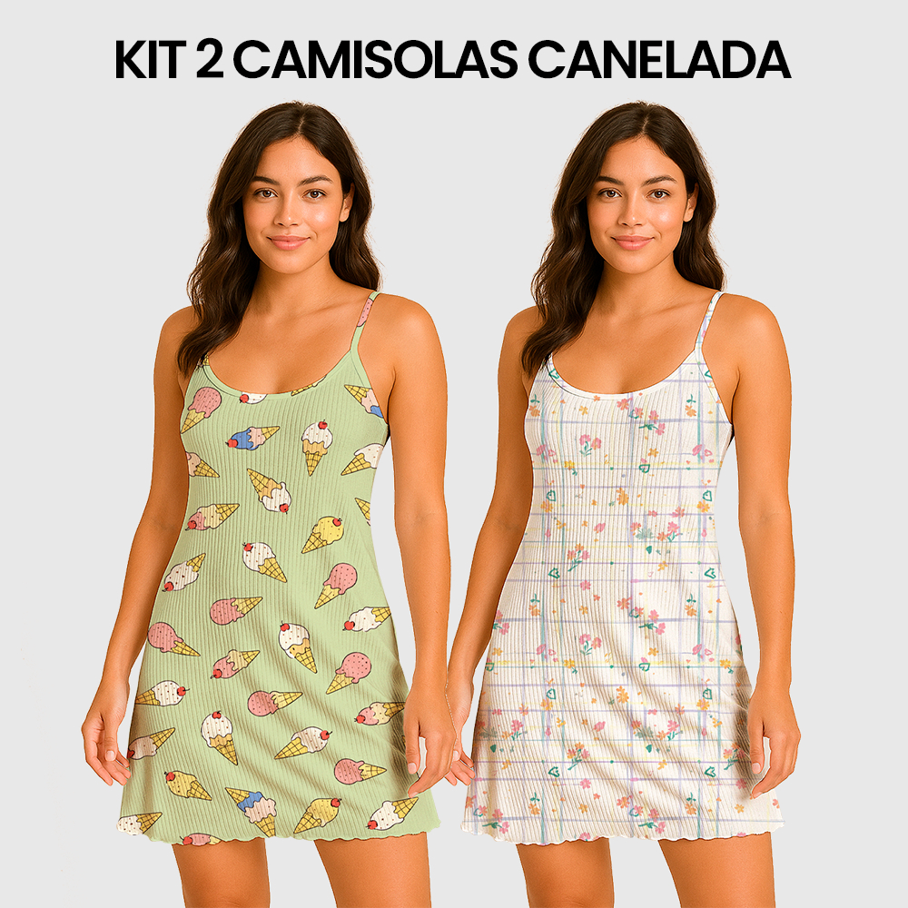 KIT 2 Camisolas Pijama Feminino Estampada Tecido em Suede Canelado - P, M, G, GG