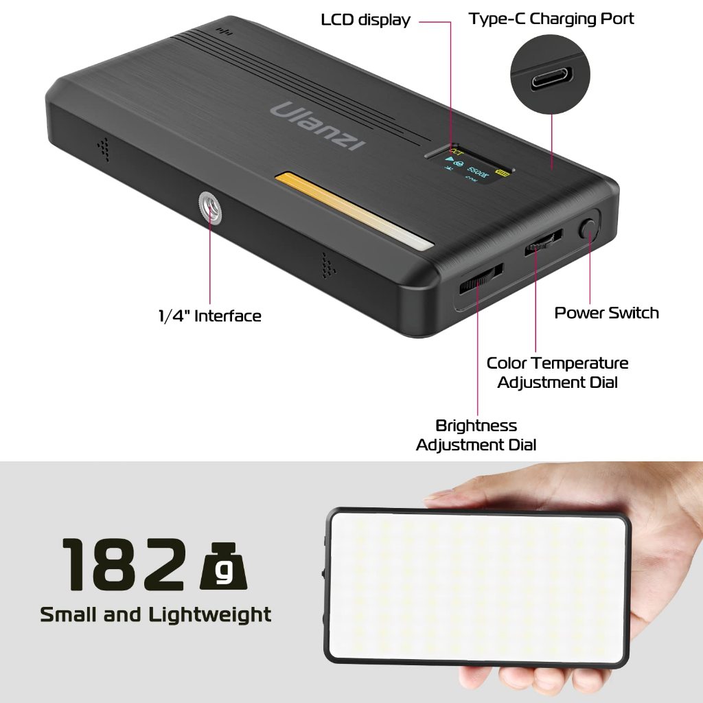 ULANZI VL200 Luz de Vídeo LED Bi-Color 2500–9000K Luz Recarregável 5000mAh USB-C para Foto e Vídeo