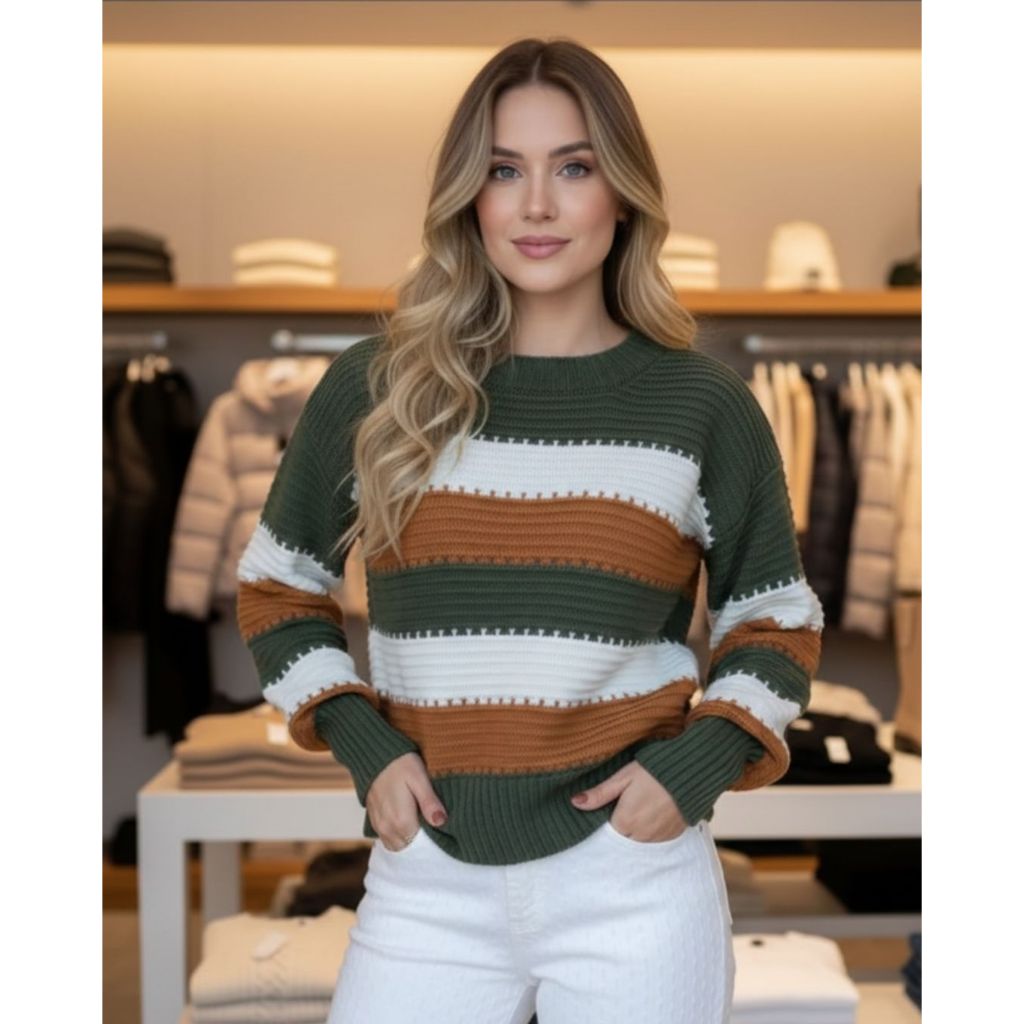 Blusa de Frio Suéter Feminino Tricot Listrado Punho Canelado Manga Comprida Casual Outono Inverno