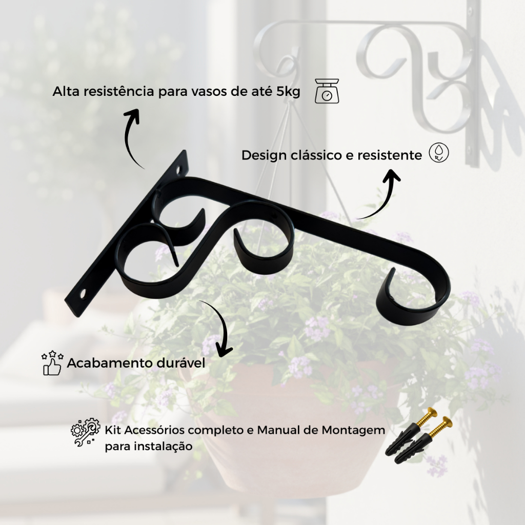 Kit 2 Suportes Para Vaso Suspenso Parede Em Aço Preto Interno Externo 5kg