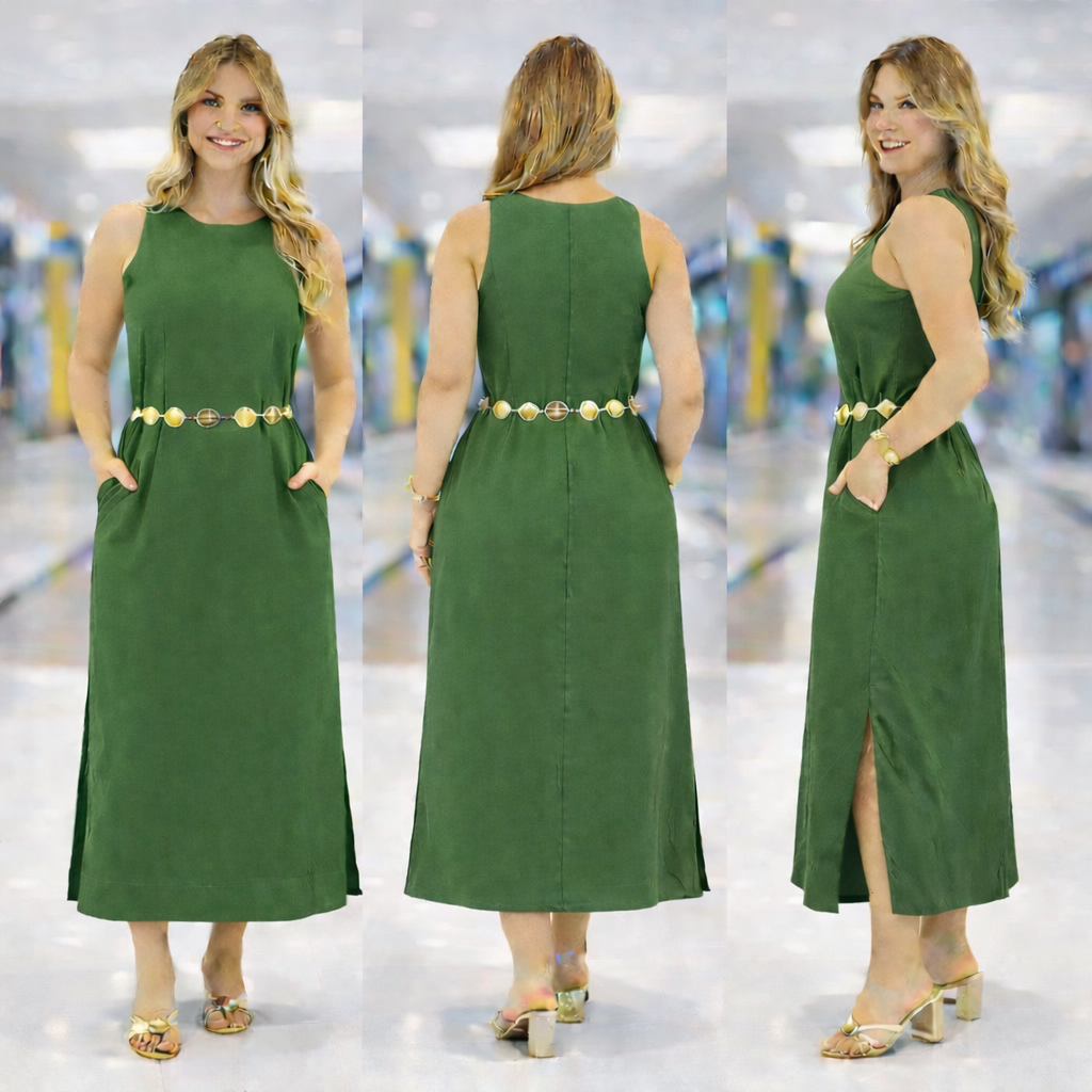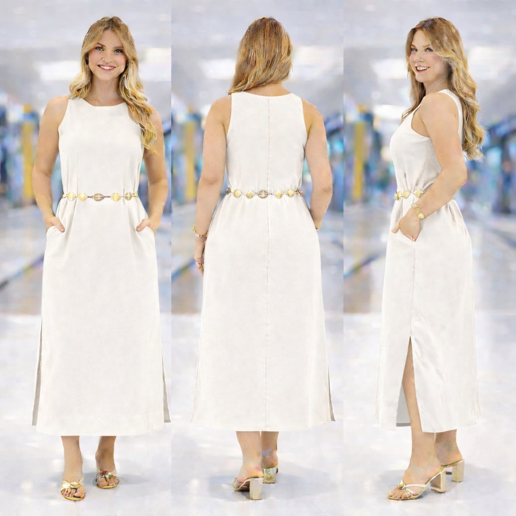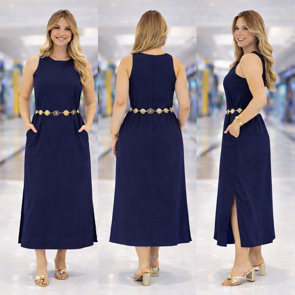 Vestido Regata Feminino em Linho com Forro Zíper nas Costas Longo com Fenda Lateral Elegante Verão