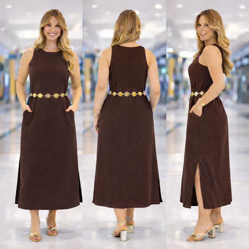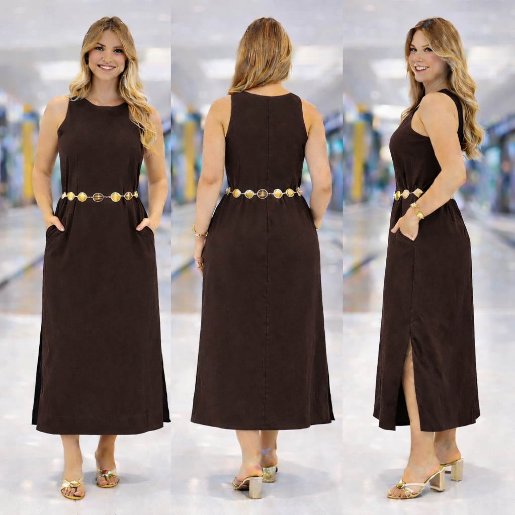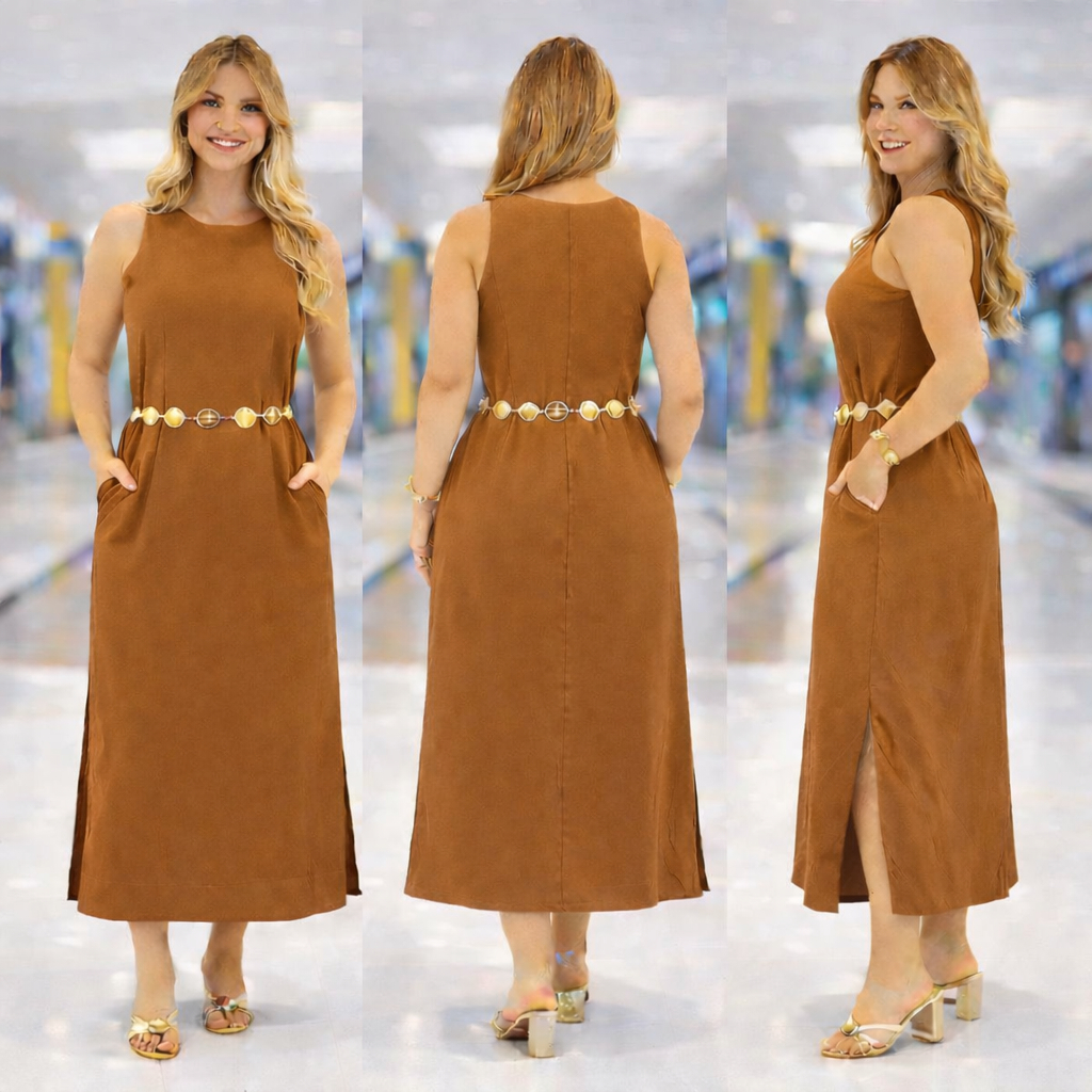 Vestido Regata Feminino em Linho com Forro Zíper nas Costas Longo com Fenda Lateral Elegante Verão