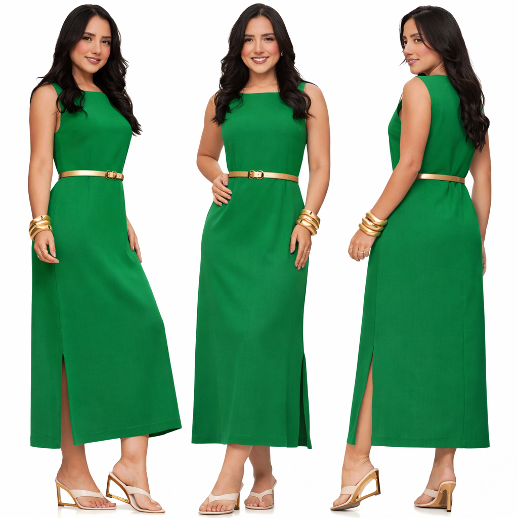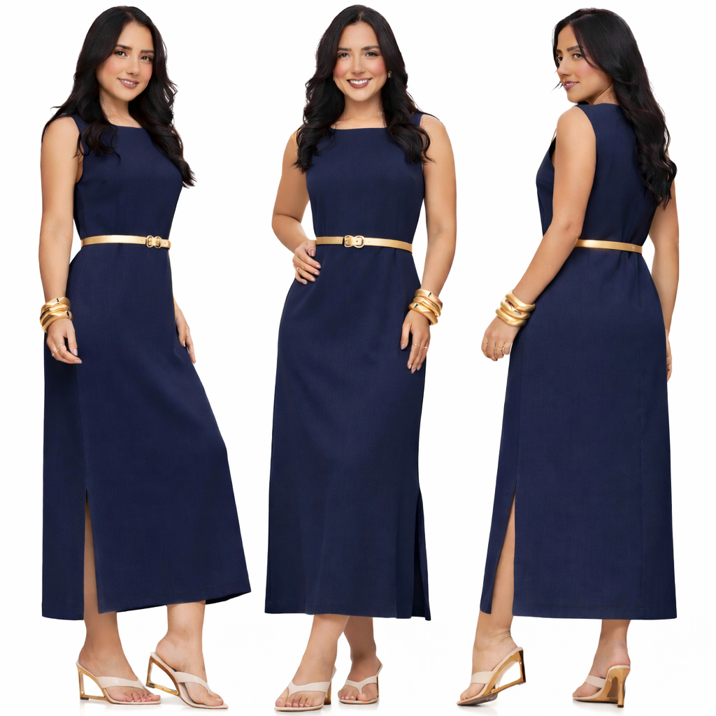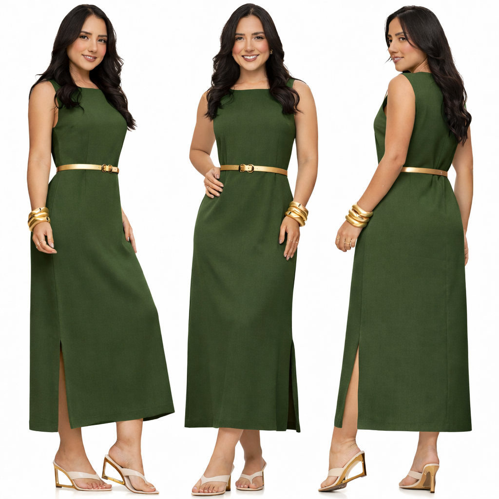 Vestido Regata Feminino Linho Verão com Forro Zíper nas Costas Longo com Fenda Lateral Elegante