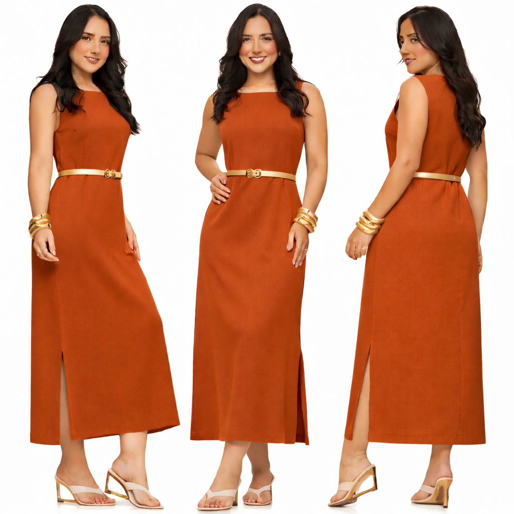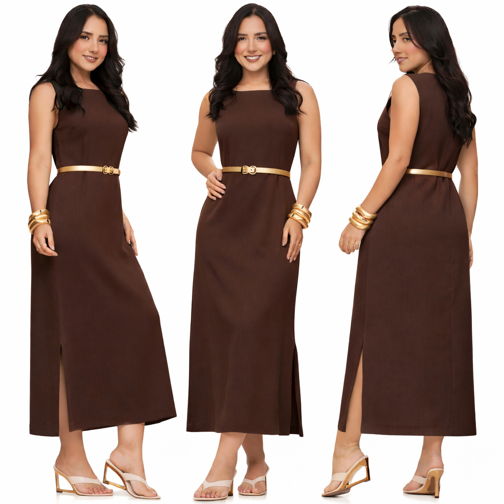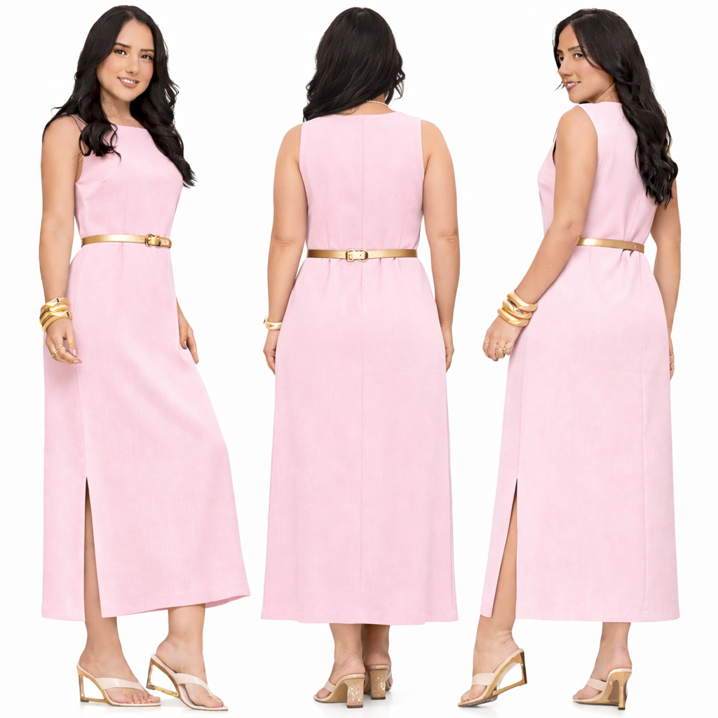Vestido Regata Feminino Linho Verão com Forro Zíper nas Costas Longo com Fenda Lateral Elegante