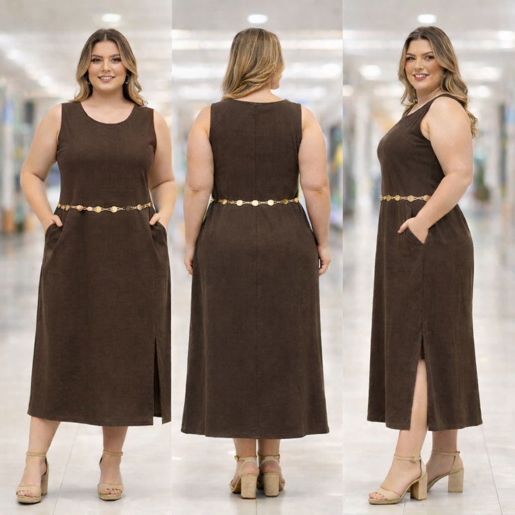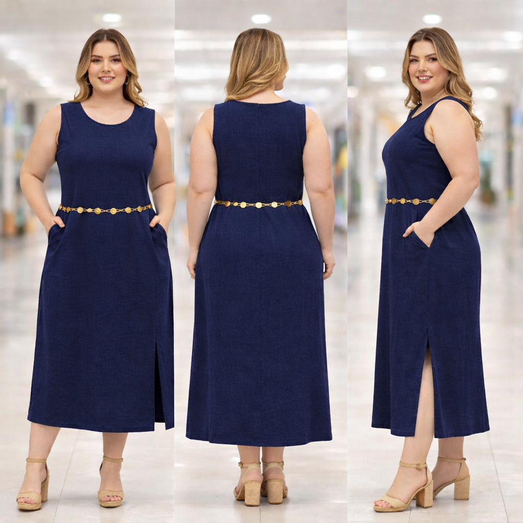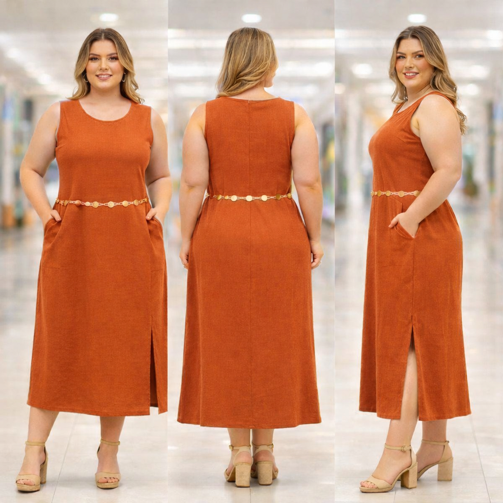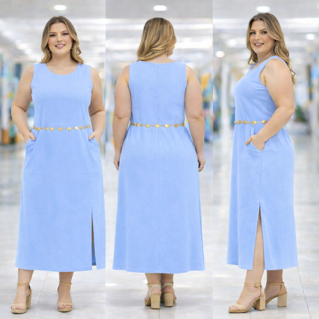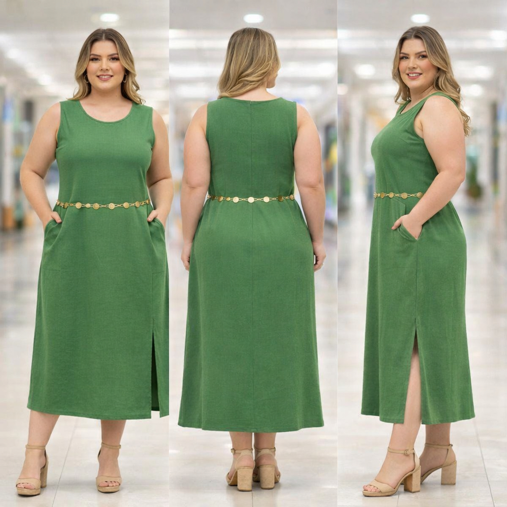 Vestido Regata Feminino Linho com Forro Zíper na Costas Longo Fenda Lateral Elegante Verão Não Pinica Plus Size GG G1 G2
