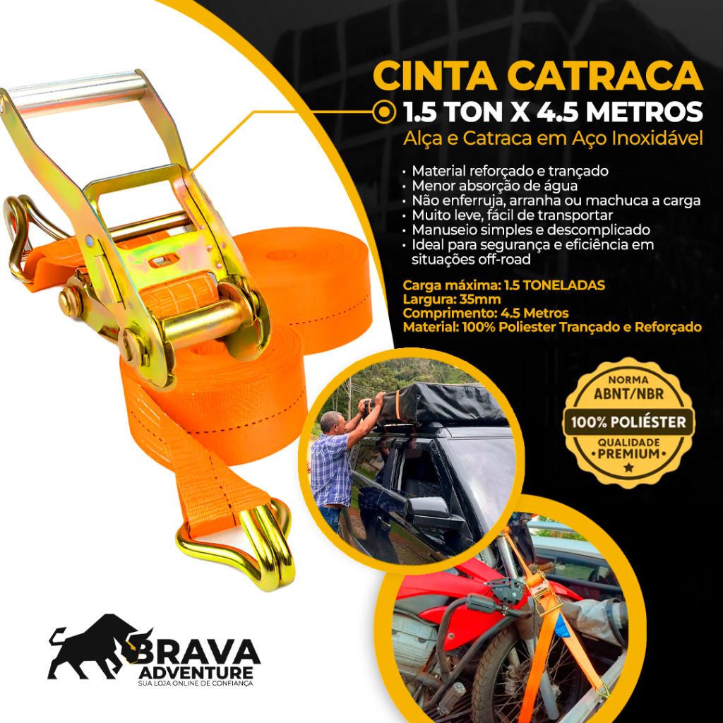 2x Kit Cinta de Amarração com Catraca 1.5 Ton 4.5 Metros 35mm Brava Adventure Carga Caminhão 100% Políester