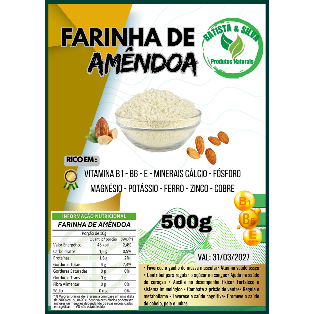 FARINHA DE AMÊNDOA 500g - Rico em VITAMINAS B1, B6, E