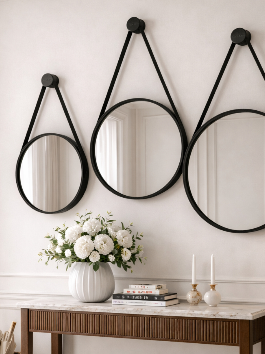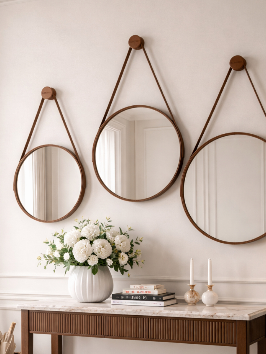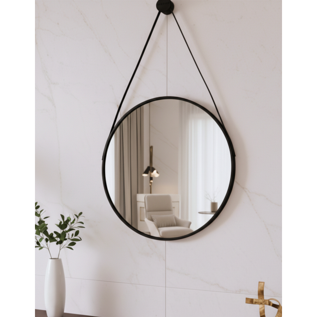Espelho Adnet Redondo 30 40 50 Cm Alça Couro Ecológico Decorativo Escandinavo Elegante Minimalista