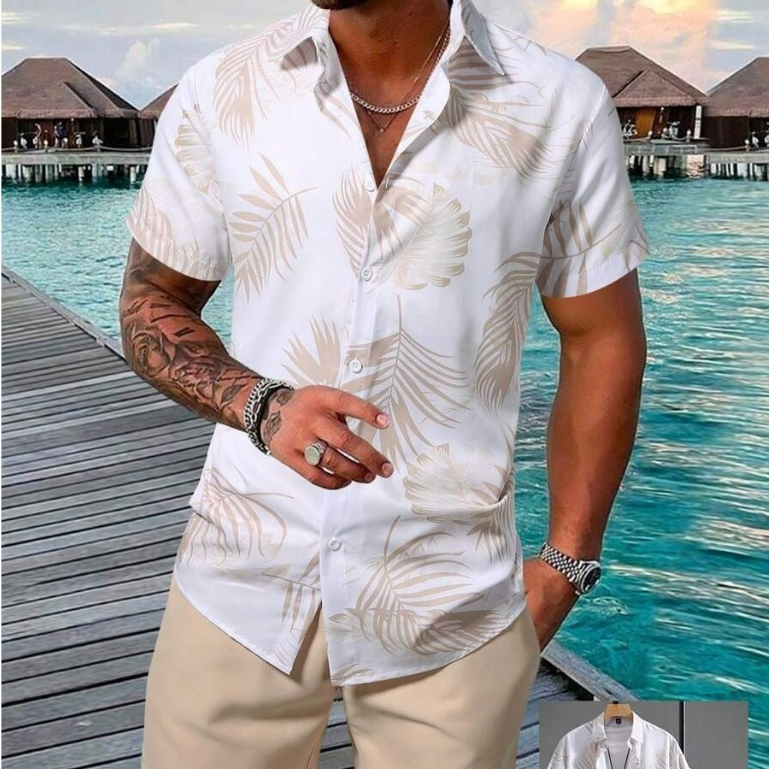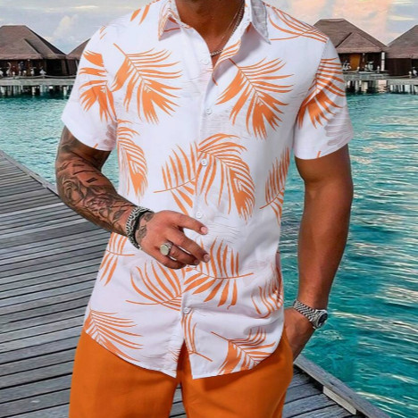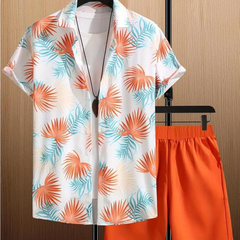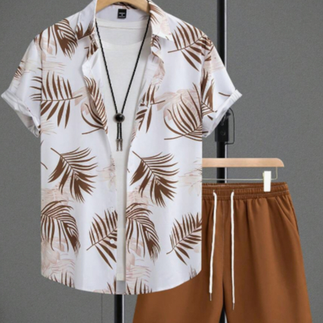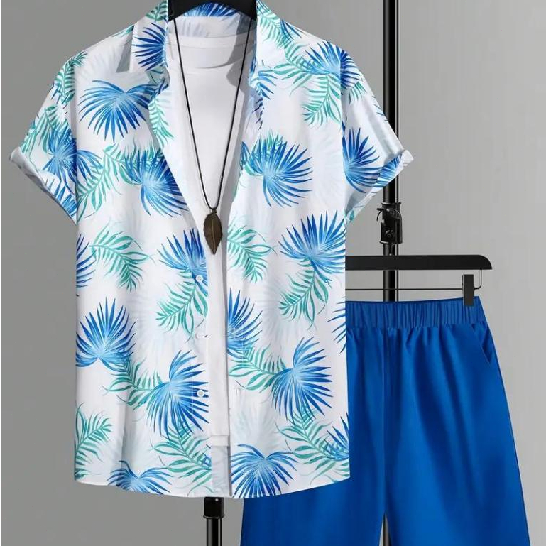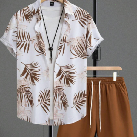 Conjunto Casual Masculino 2 Peças com Camisa de Manga Curta e Shorts Estampados Tropical