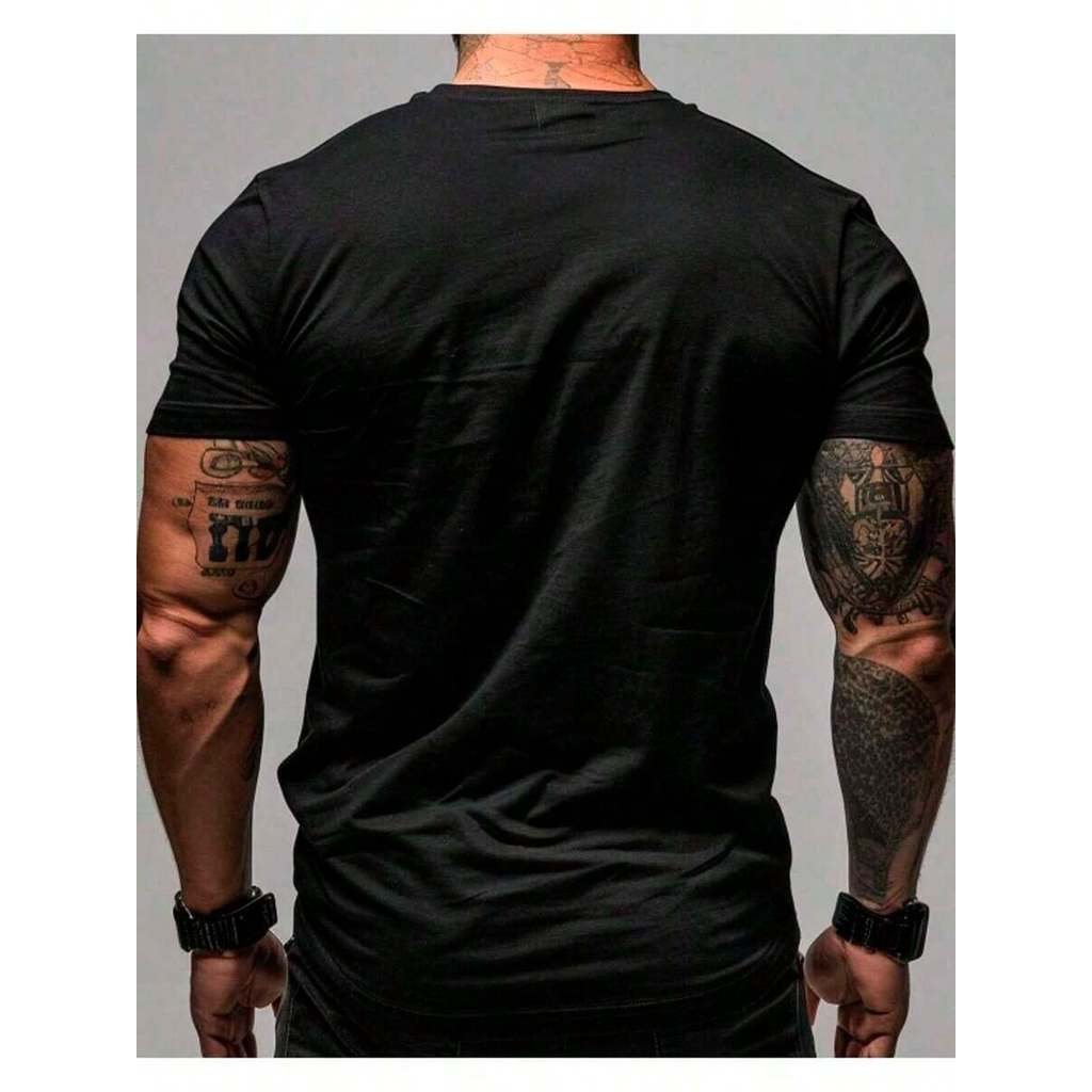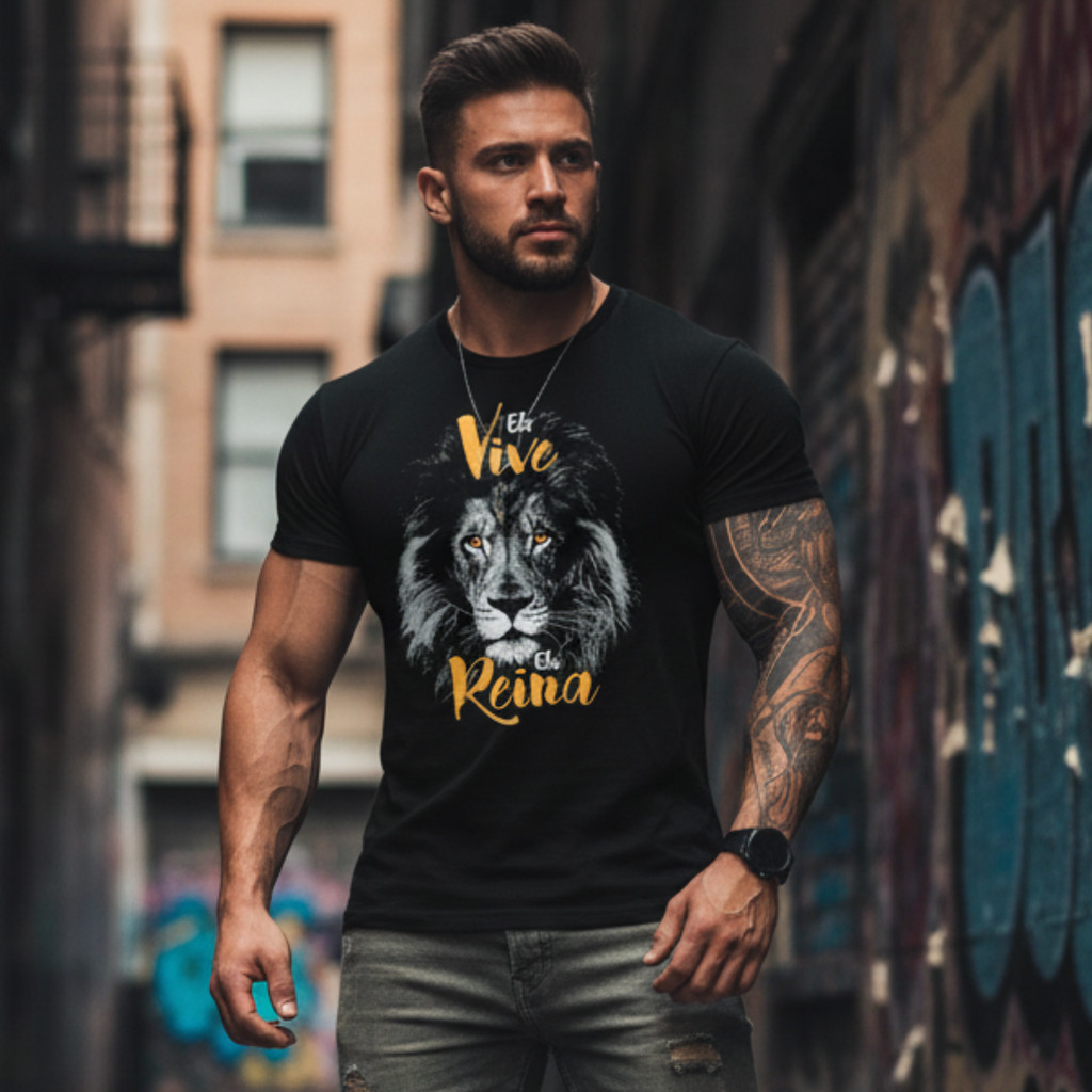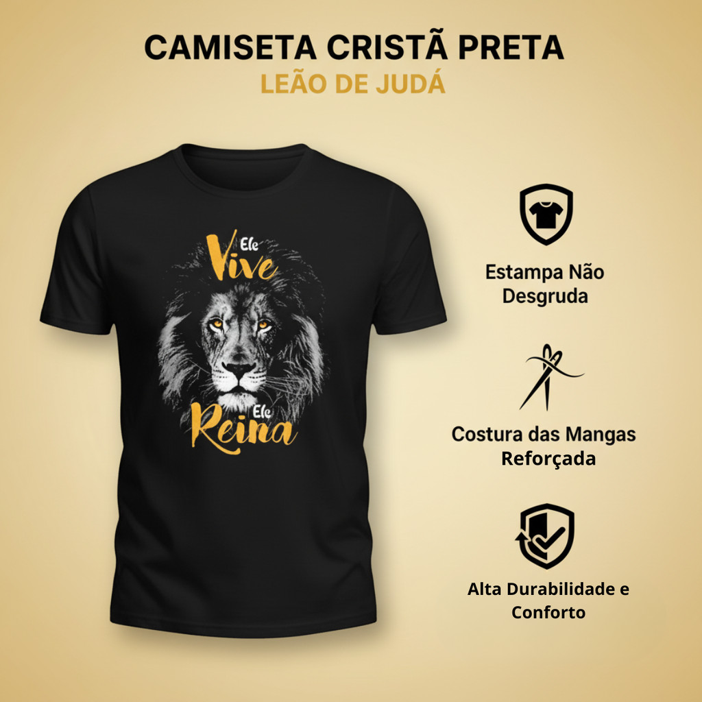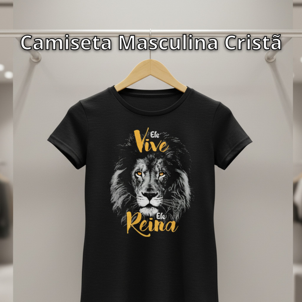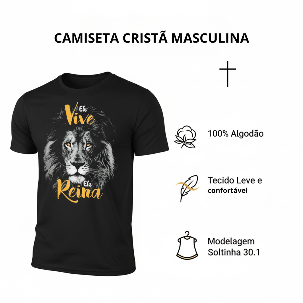 Camiseta Masculina Cristã Leão Vive Reina – Camisa Gospel 100% Algodão Preta Gola Redonda