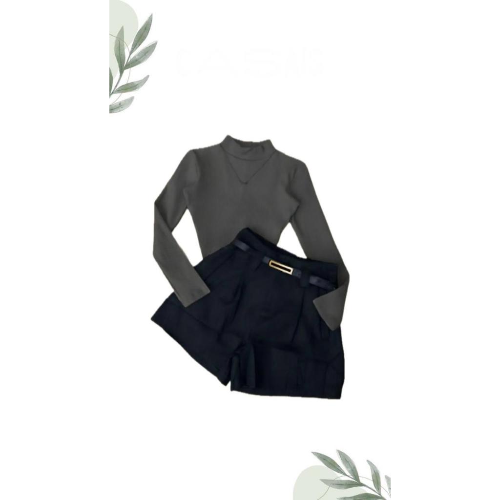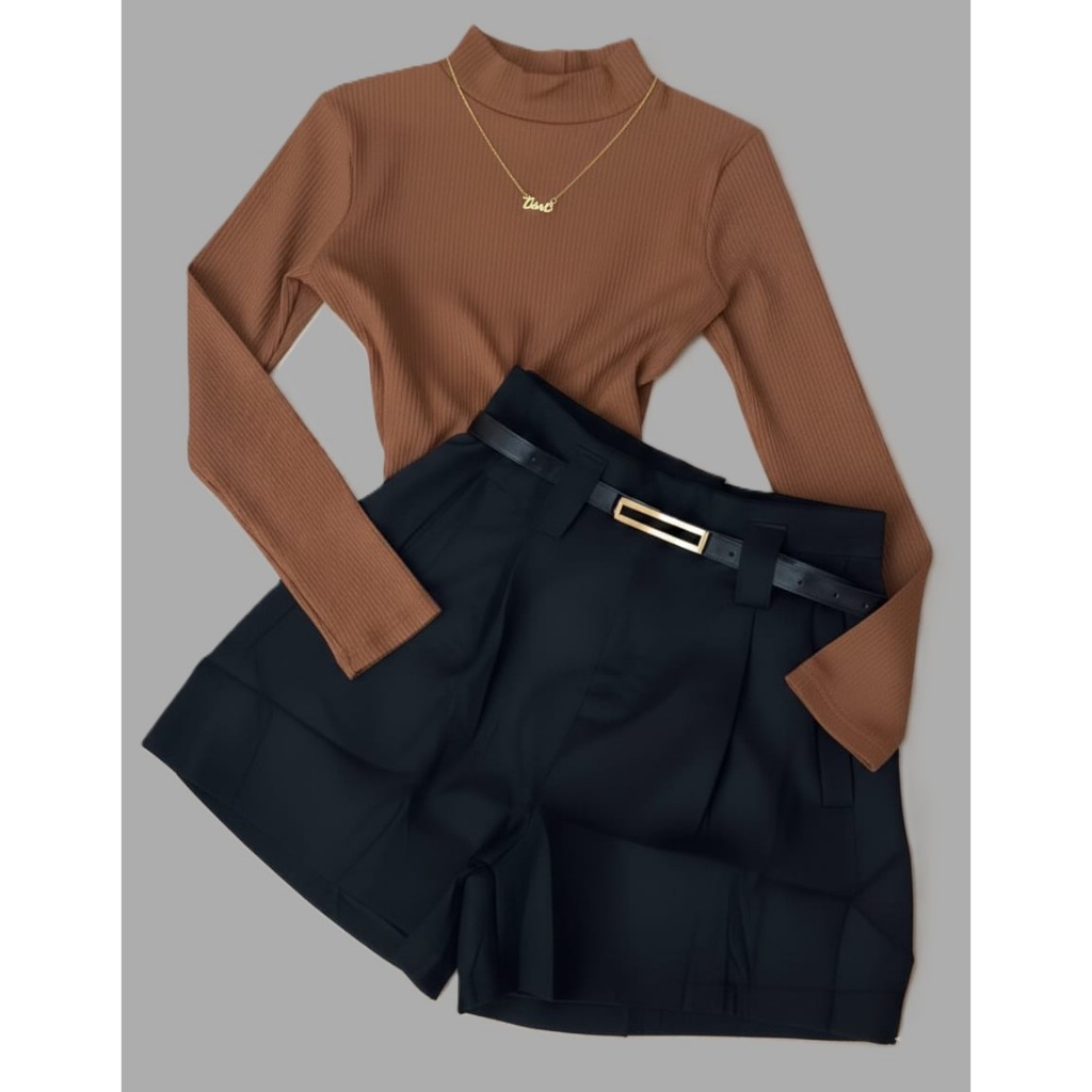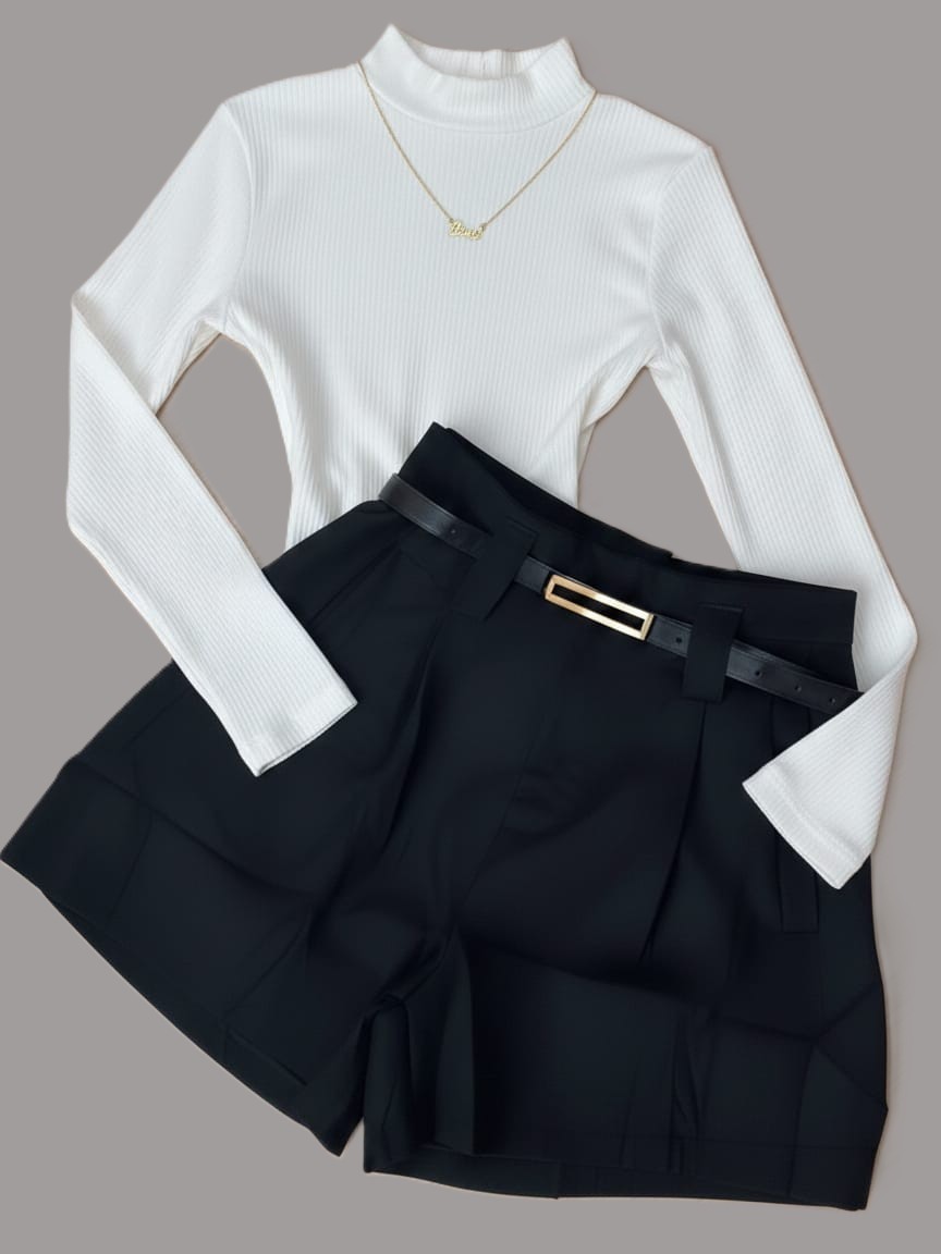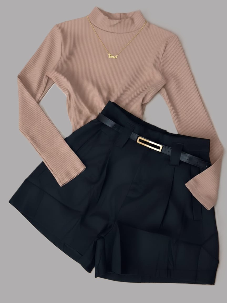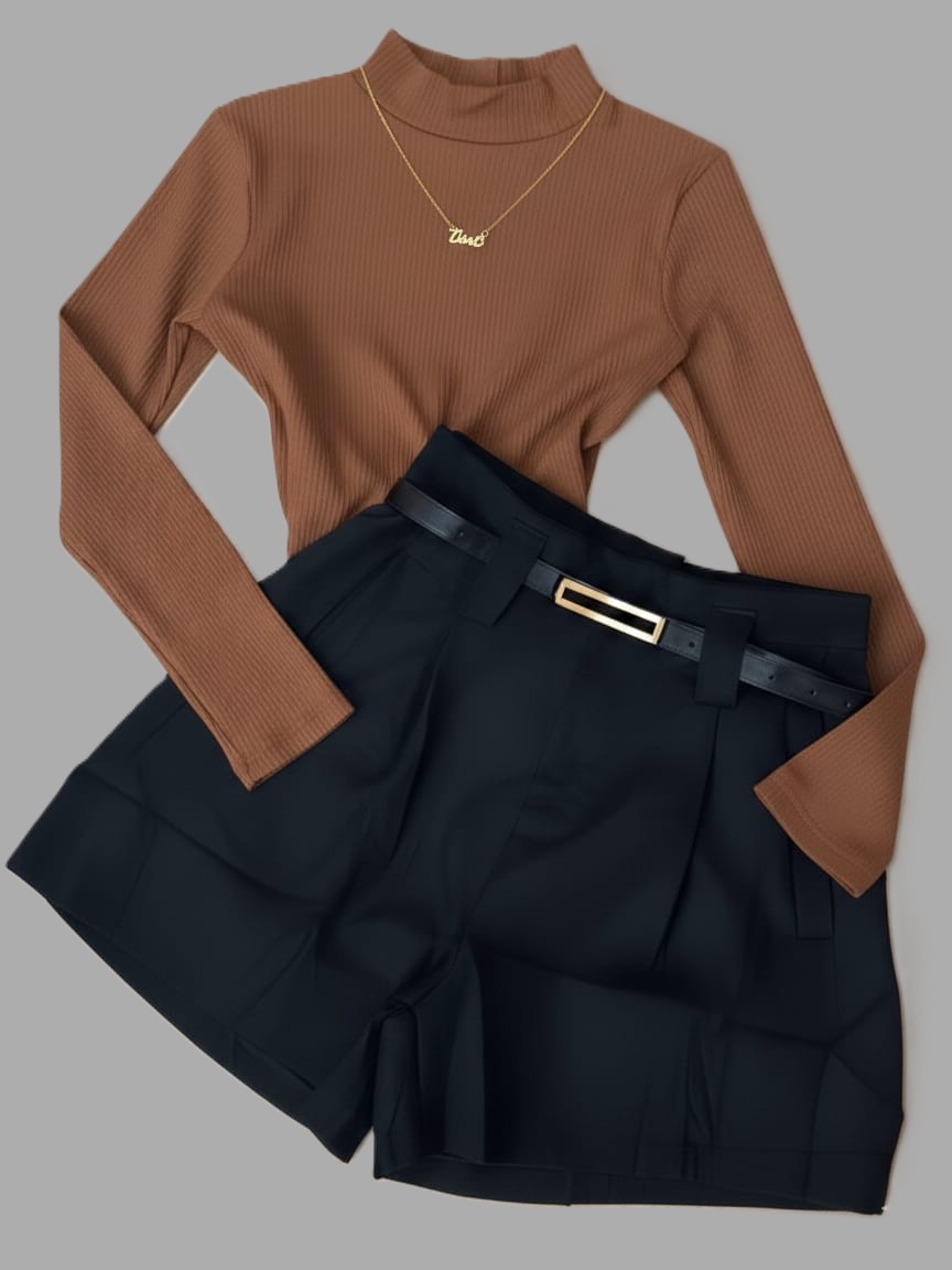Conjunto Bory Manga Longa Gola Alta Suplex e Short Alfaiataria com Cinto Ajustável Meia-Estação/Inverno