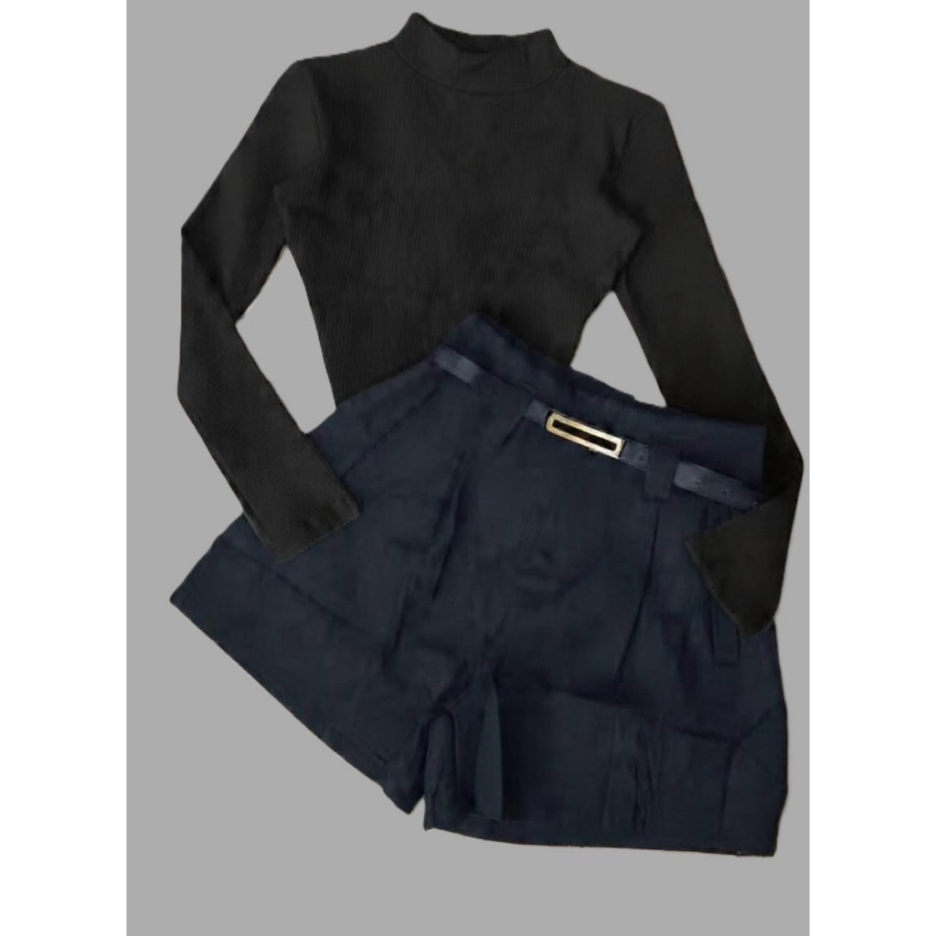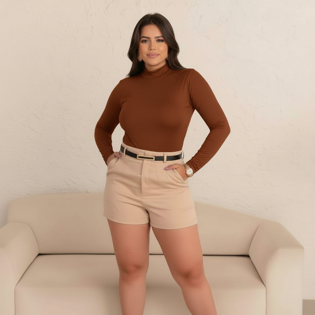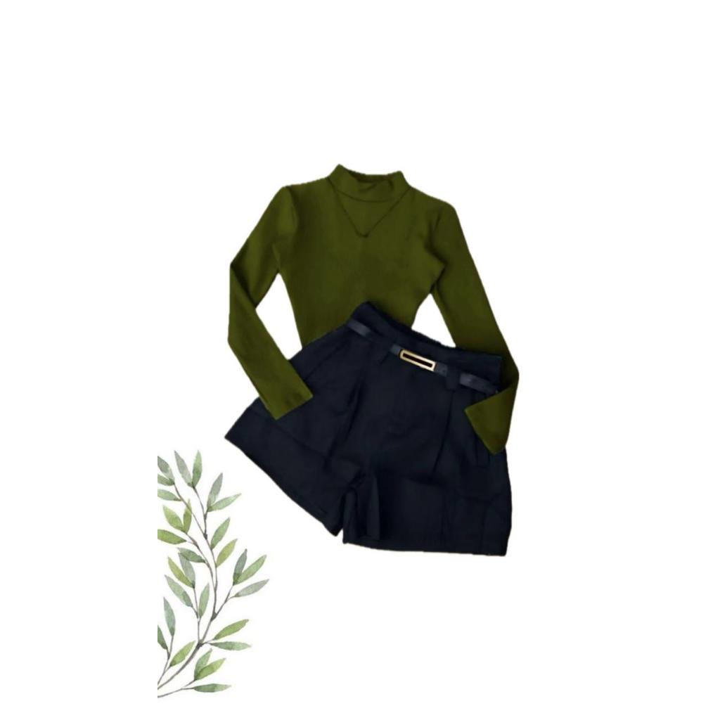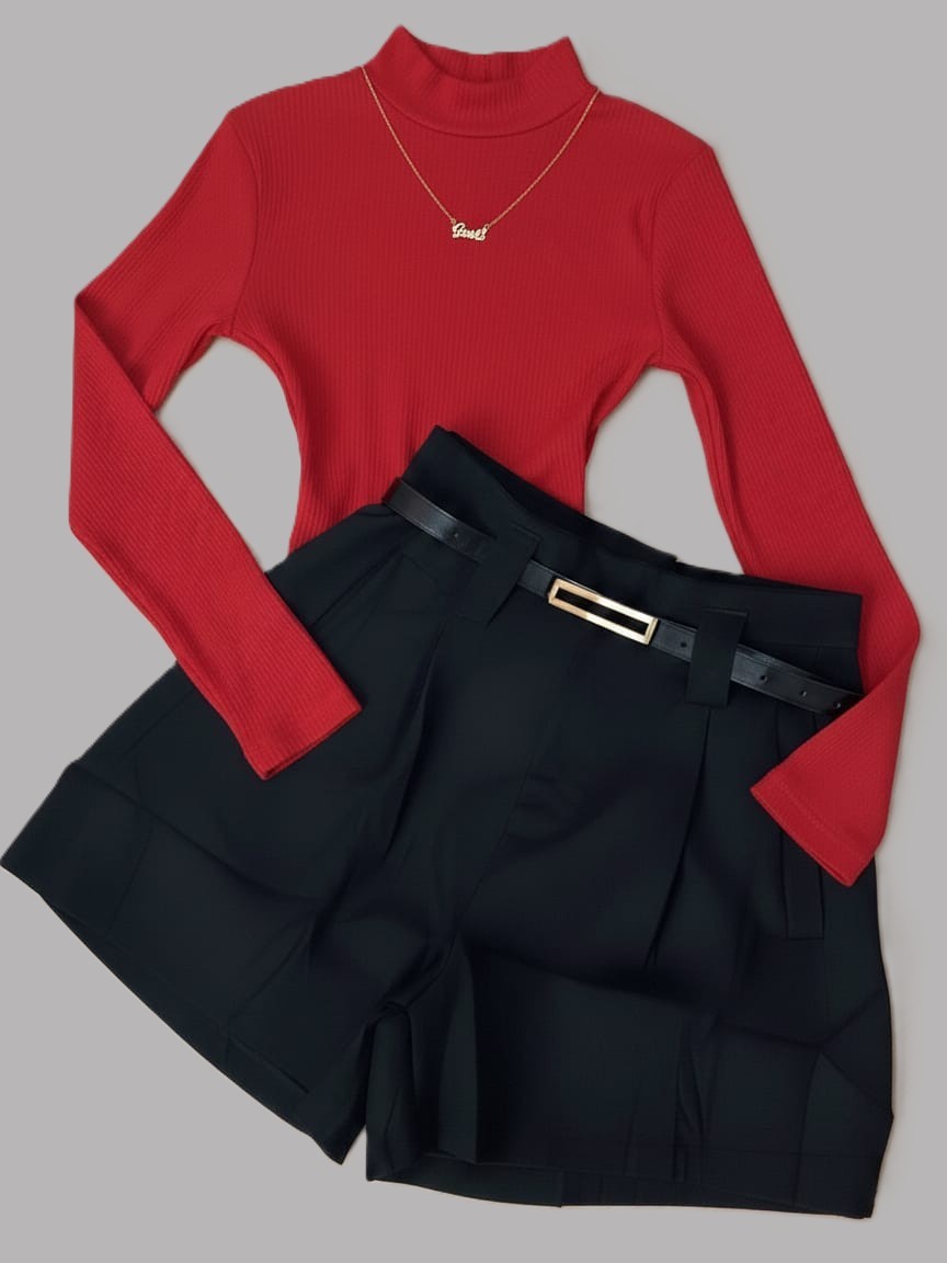Conjunto Bory Manga Longa Gola Alta Suplex e Short Alfaiataria com Cinto Ajustável Meia-Estação/Inverno