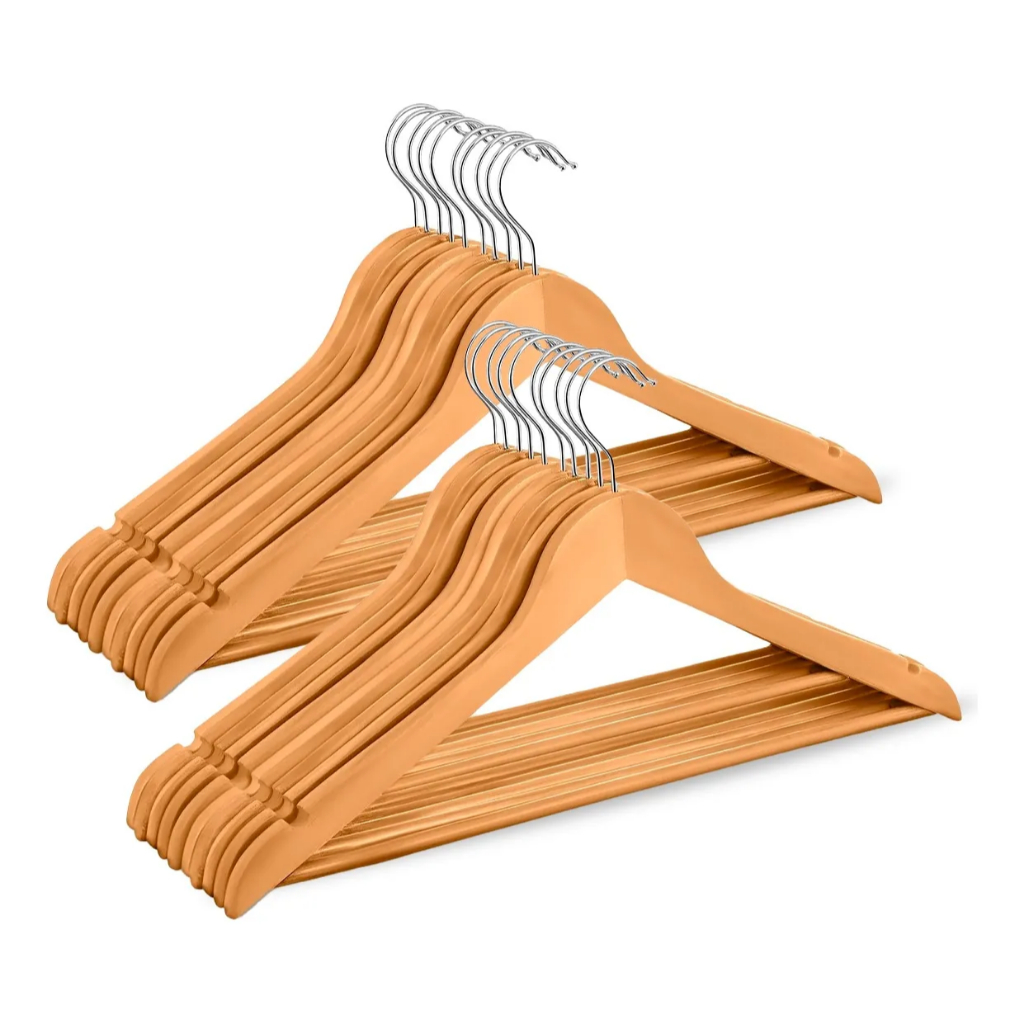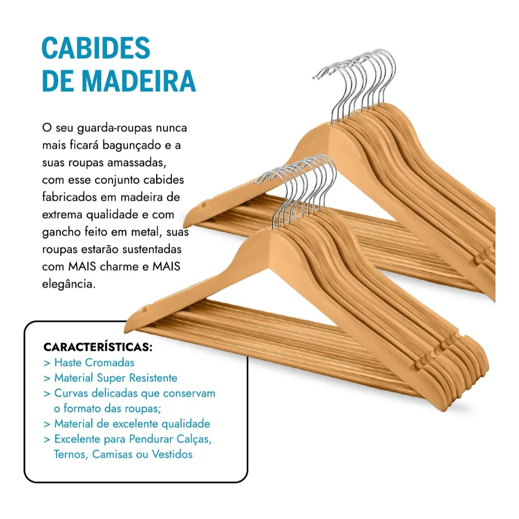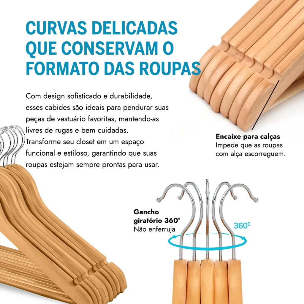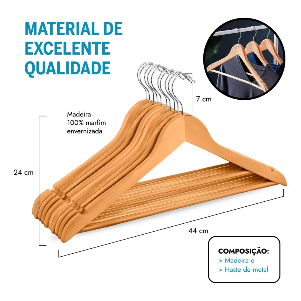 Cabide Madeira Vithu Kit 20 Unidades Envernizado Adulto Gancho Giratorio Roupas Camiseta Camisa Closet