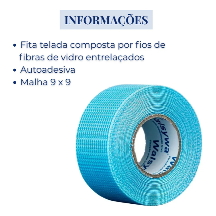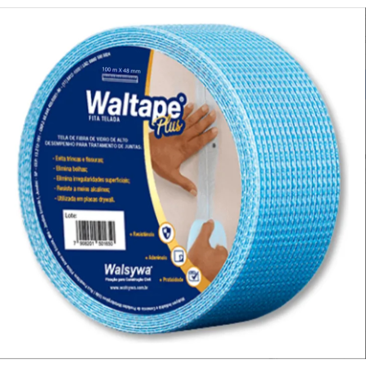 Fita Telada Waltape 100m X 48mm Drywall Fibra De Vidro Autoadesiva Azul