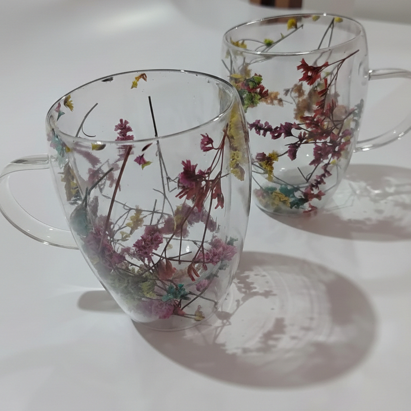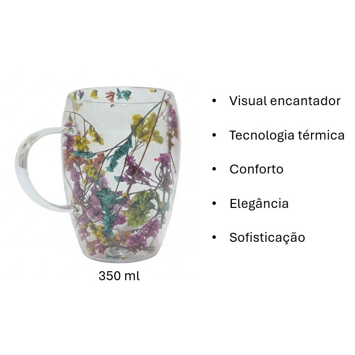 Caneca florida com vidro duplo de borossilicato 350ml flores secas entre os vidros