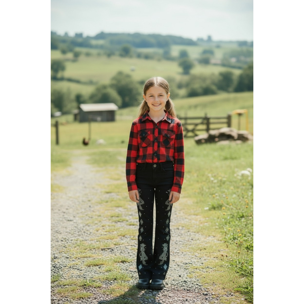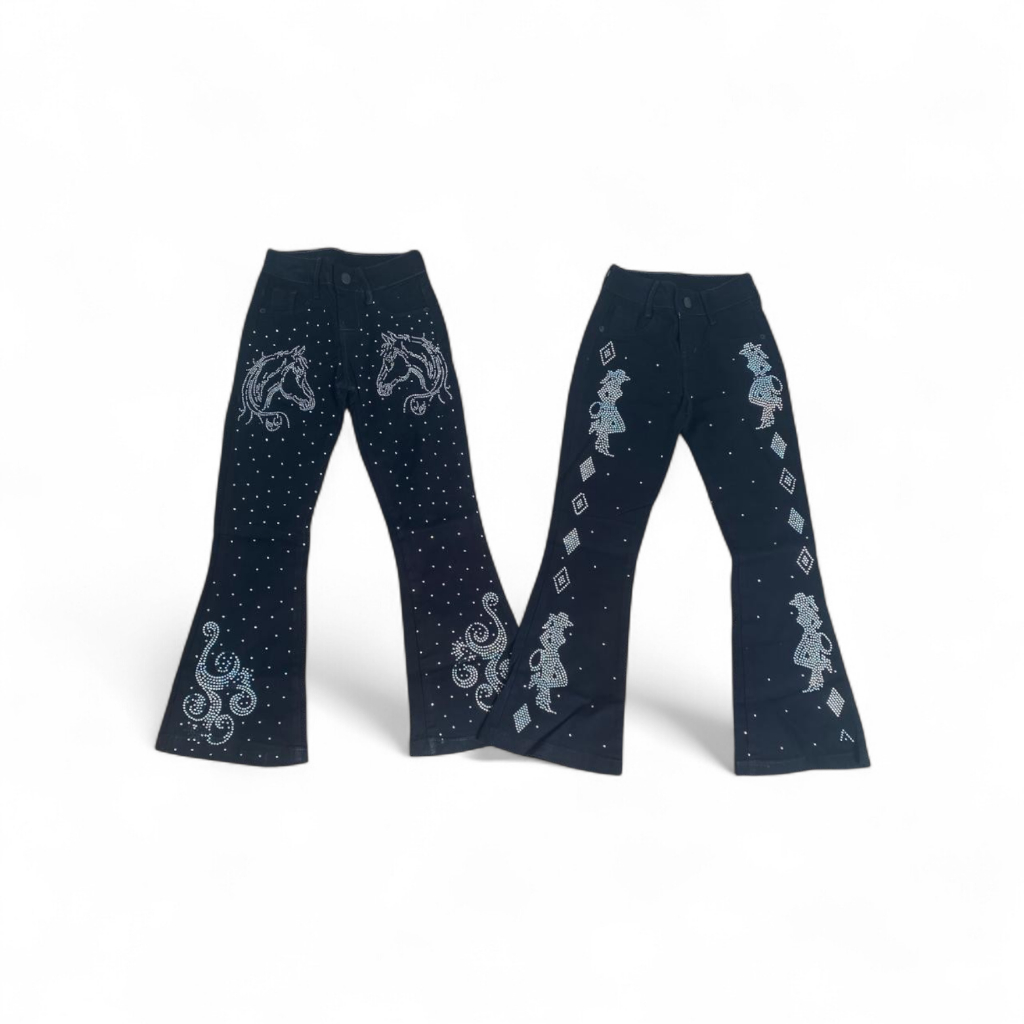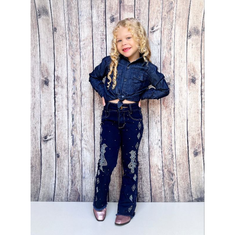 CALÇA JEANS FLARE FEMININA INFANTIL COUNTRY/RODEIO BORDADA/STRASS BOIADEIRA SURPRESA