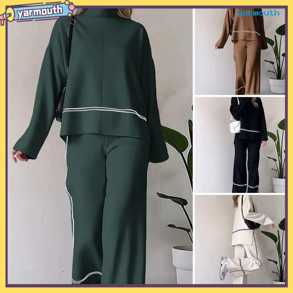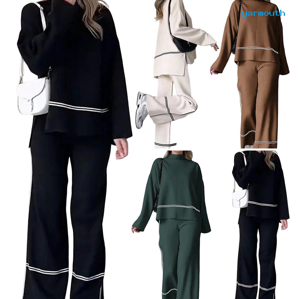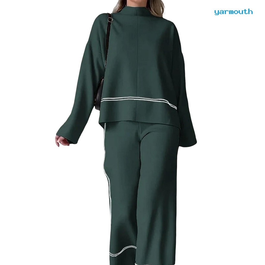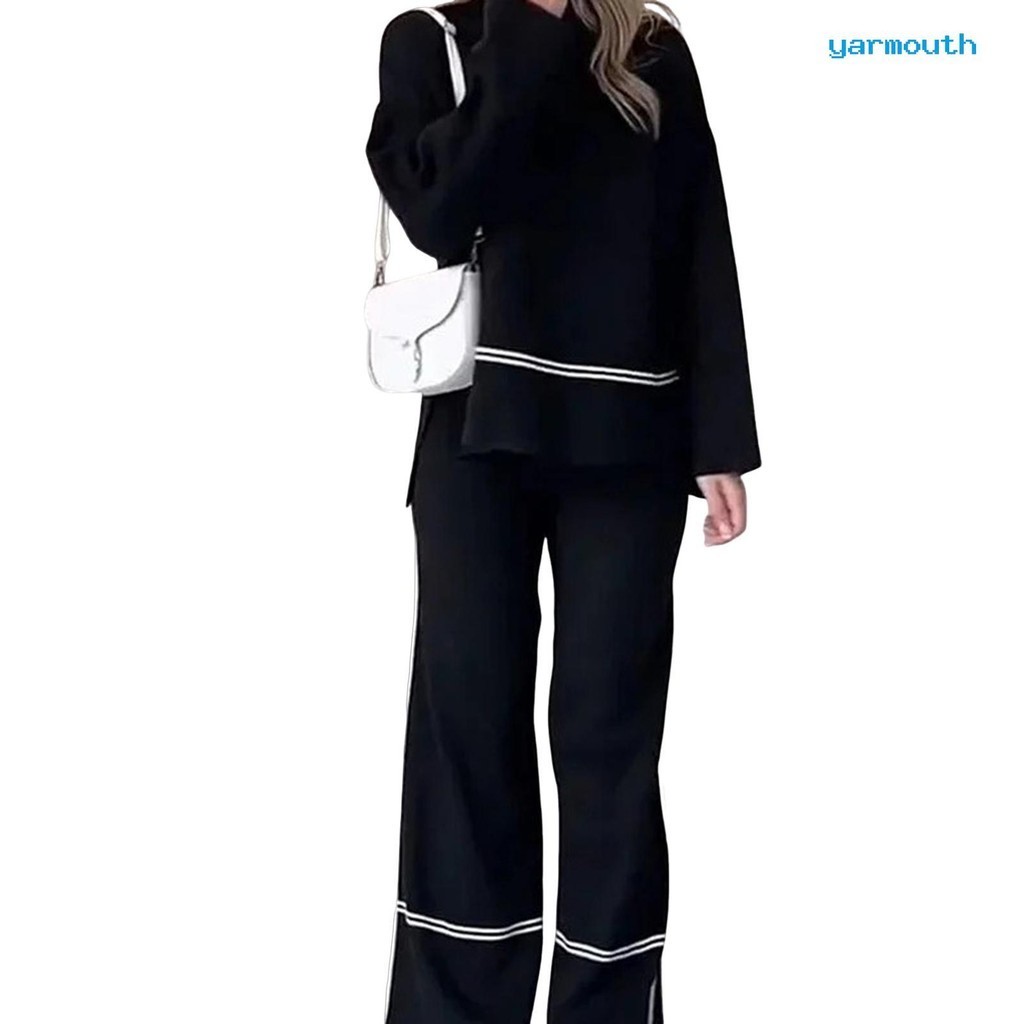 [YA] 2 Pcs/Set Calças De Topo Feminino Conjunto De Pescoço Redondo Manga Longa Cor Sólida Top Esticado Cintura Alta Perna Larga Fato De Pista Desportiva Casual Solto