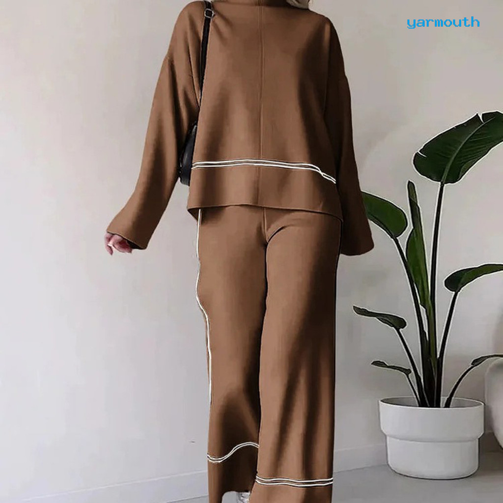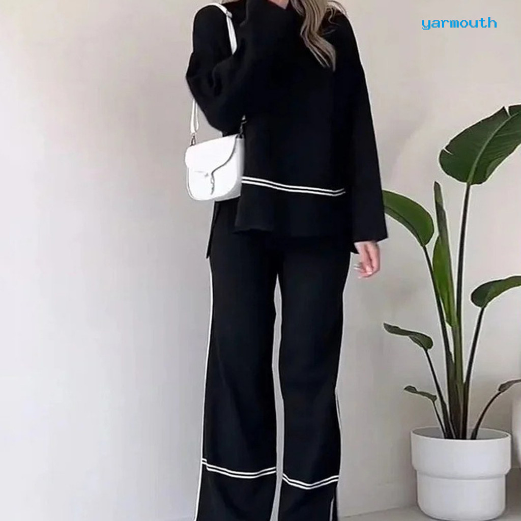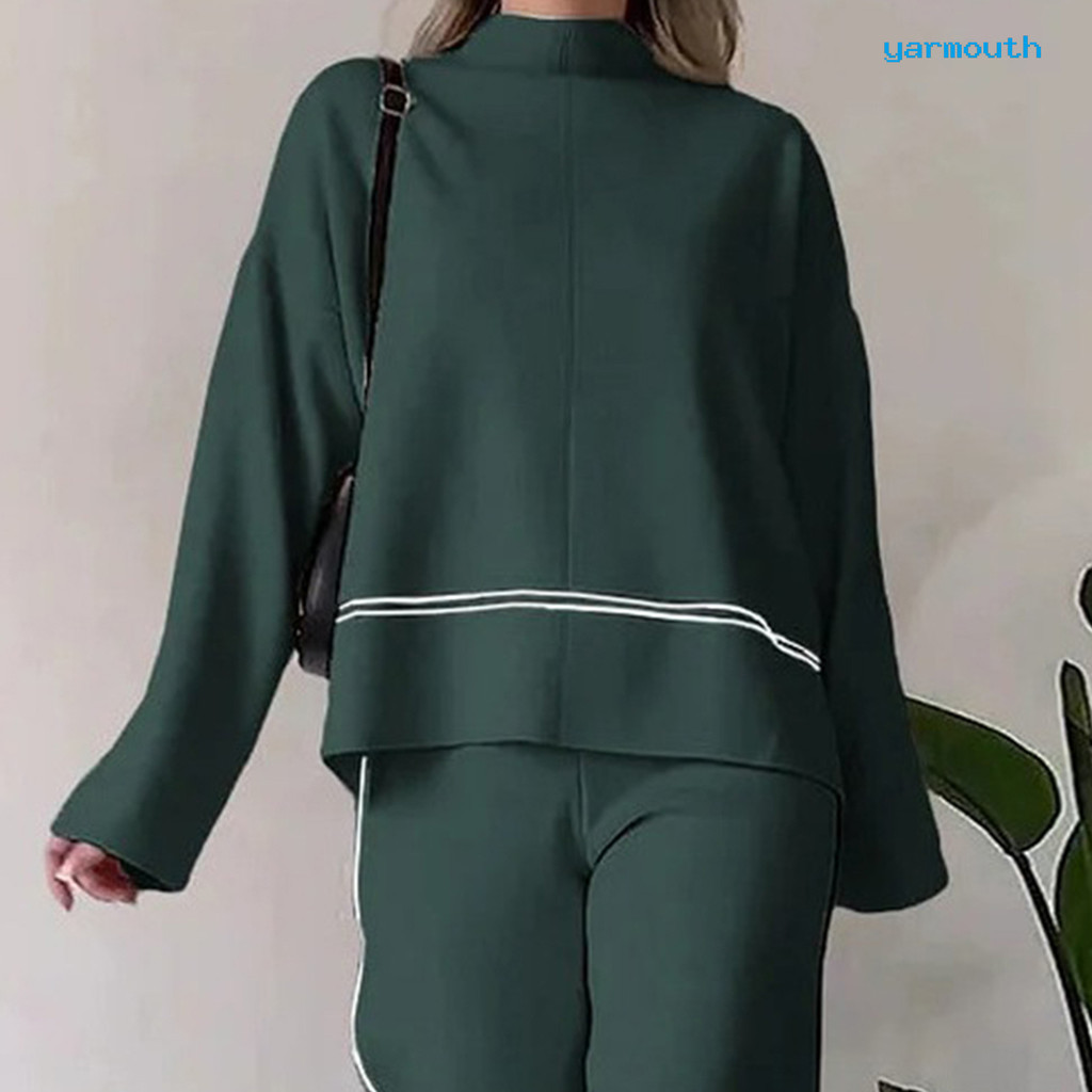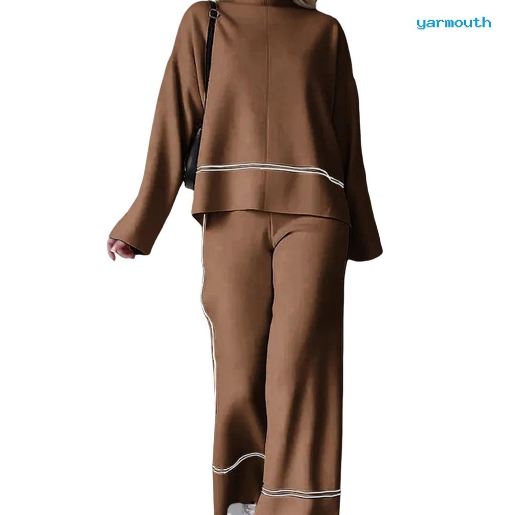[YA] 2 Pcs/Set Calças De Topo Feminino Conjunto De Pescoço Redondo Manga Longa Cor Sólida Top Esticado Cintura Alta Perna Larga Fato De Pista Desportiva Casual Solto