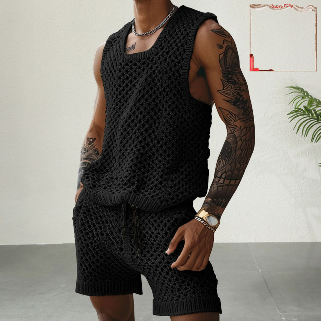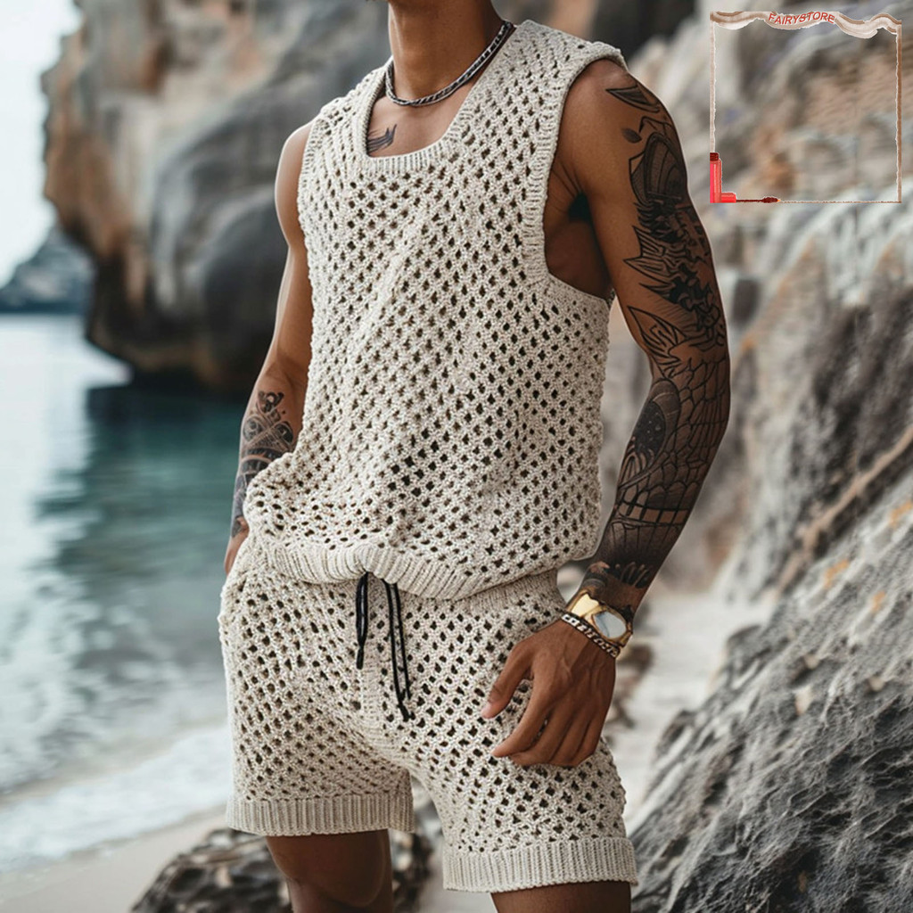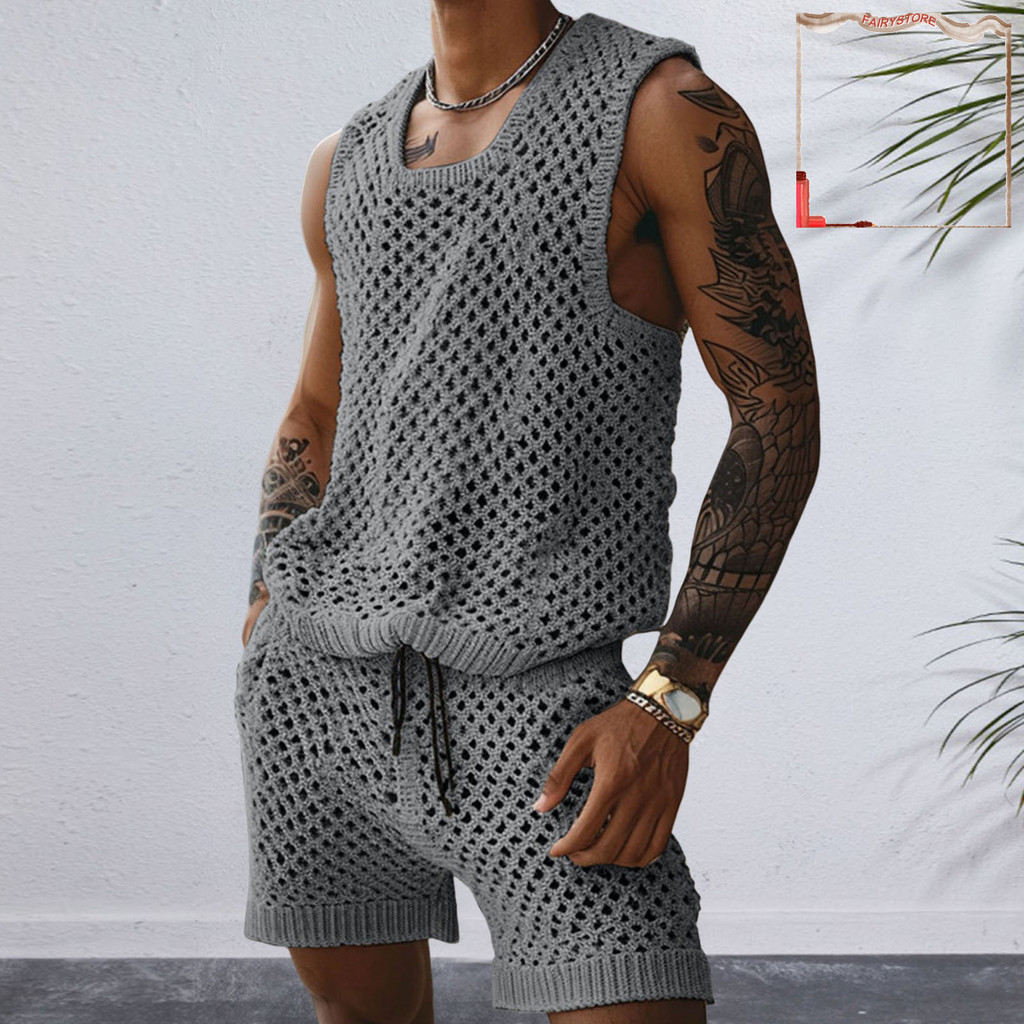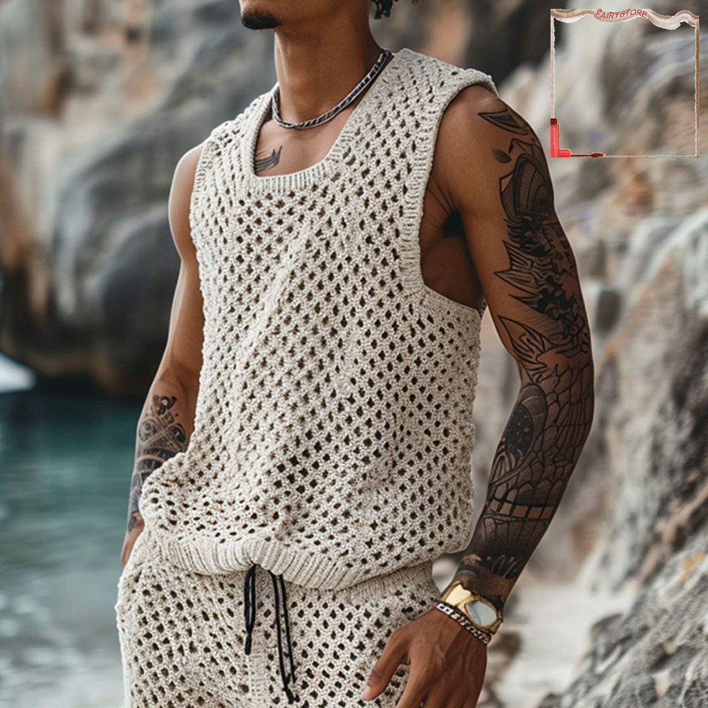 [FYS] 2 Unidades/Conjunto Masculino Roupa Casual Gola Redonda Sem Mangas Tricô Tops Elástico Cordão Cintura Perna Larga