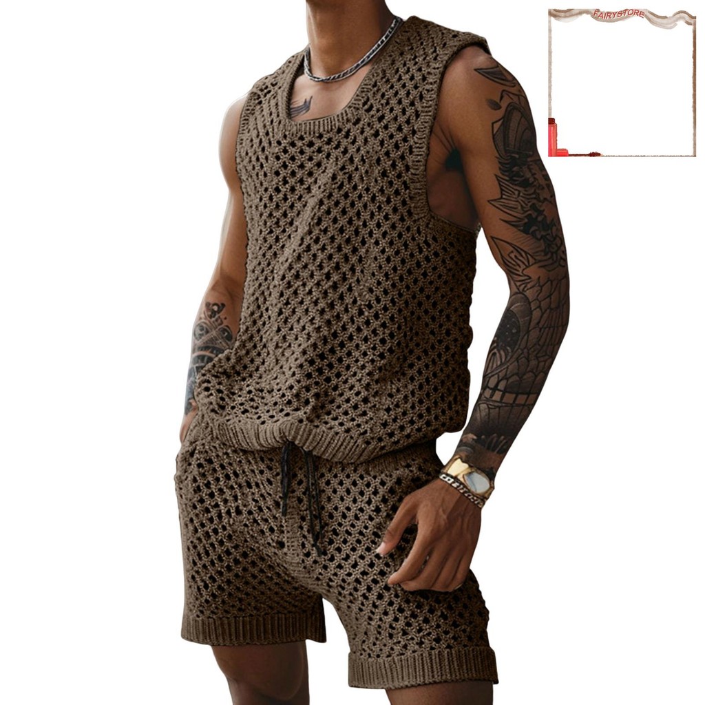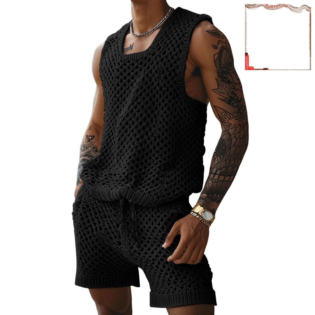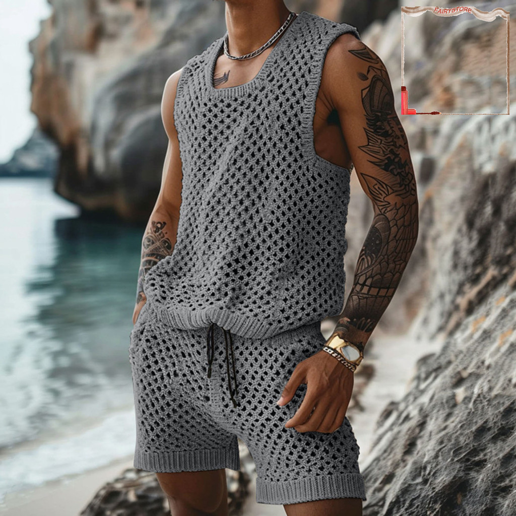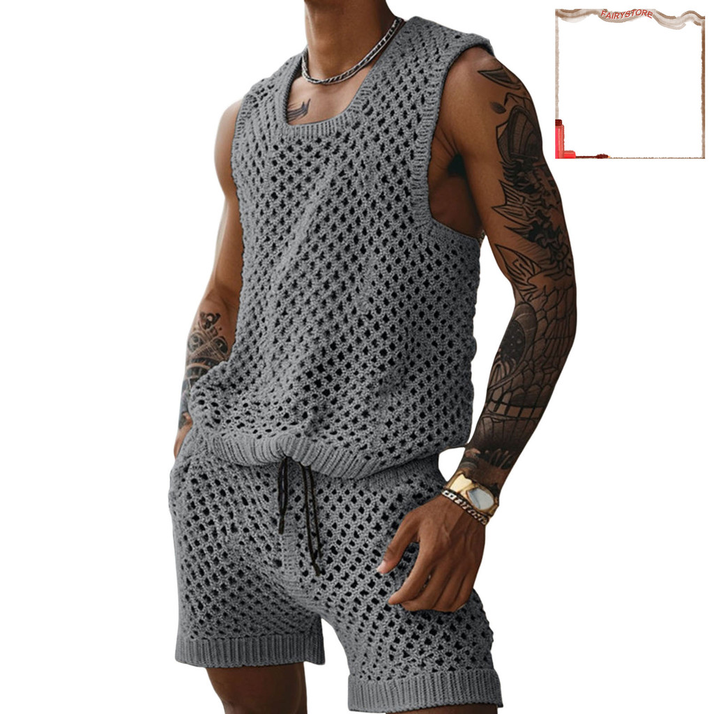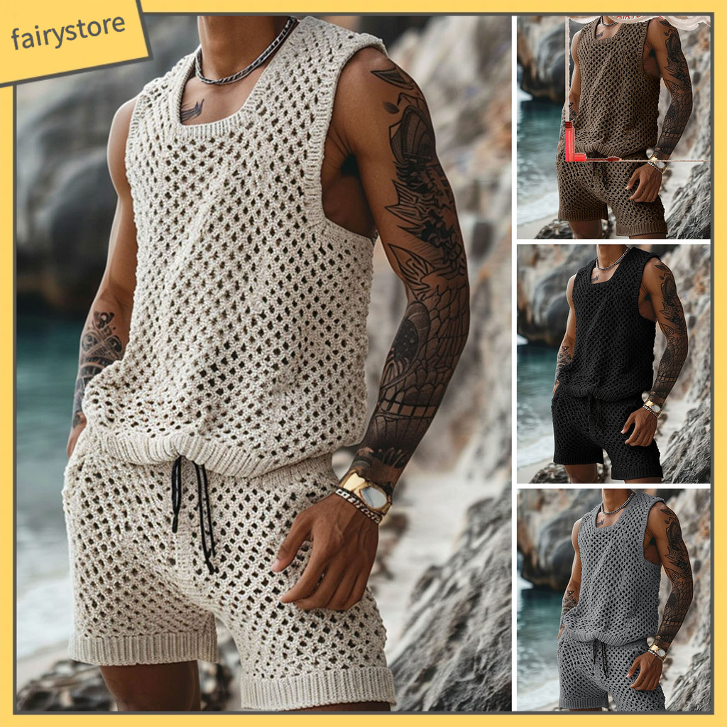 [FYS] 2 Unidades/Conjunto Masculino Roupa Casual Gola Redonda Sem Mangas Tricô Tops Elástico Cordão Cintura Perna Larga