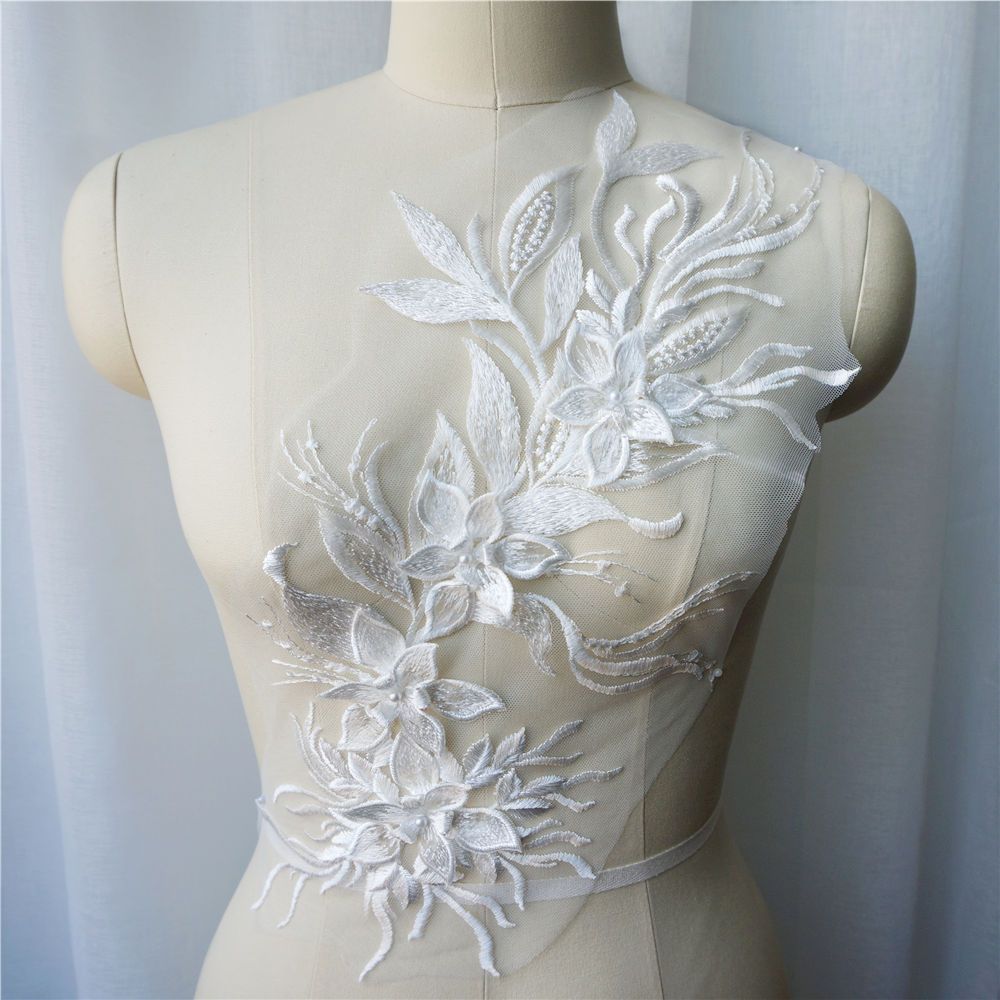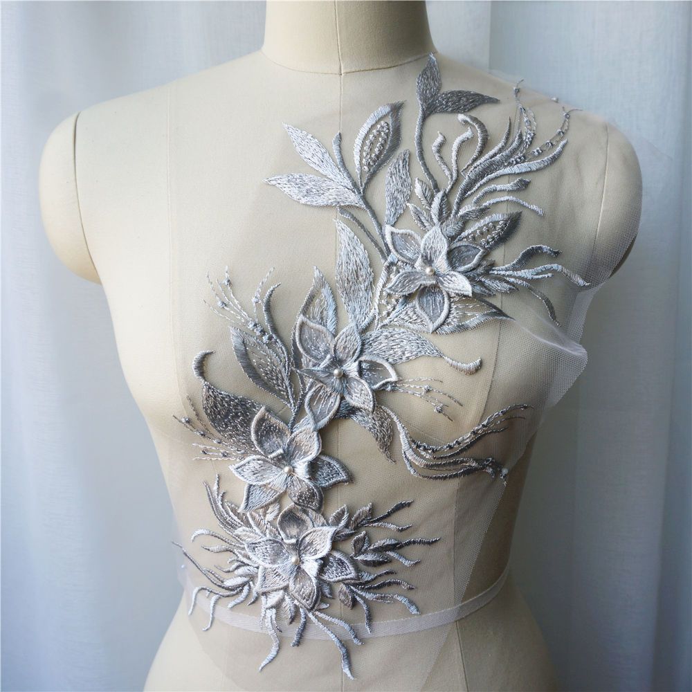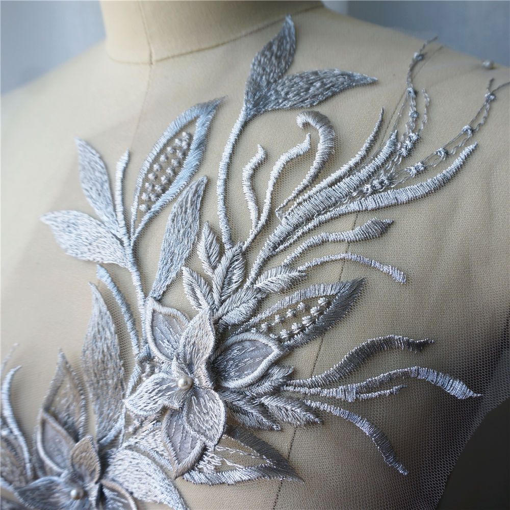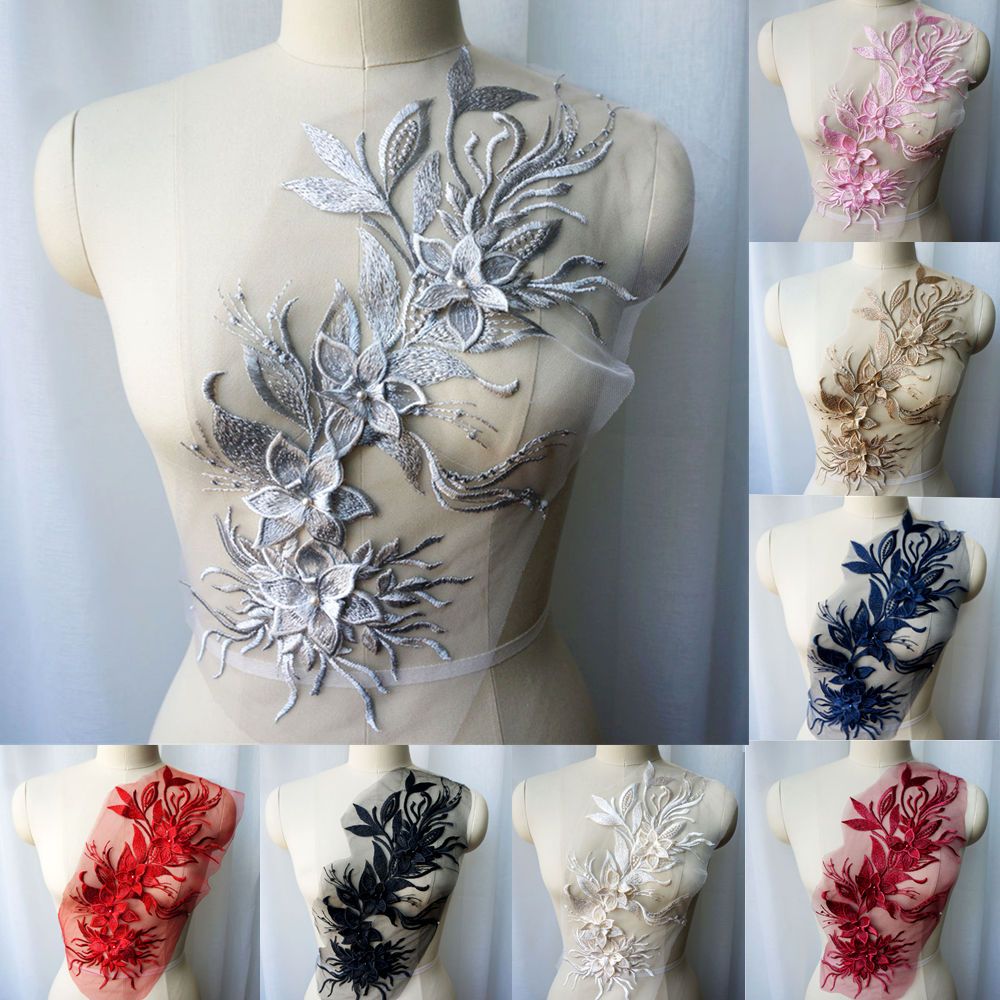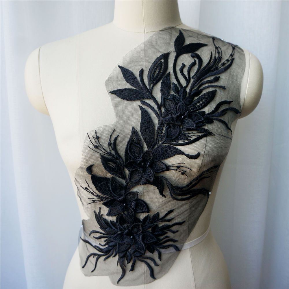 Branco Preto Cinza 3D Flor Borla Renda Tecido Vestido Apliques Gola Bordada Malha Costura Remendo Para Casamento Roupas